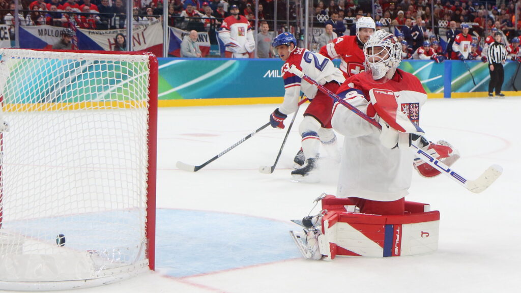 Game Winning Goal, Lukas Sedlak #23, Lukas Dostal #1, Pius Suter #44, Olympic Games 2026 Mens Hockey SUI – CZE , Santa Giulia Arena, Milano © Puckfans.at / Andreas Robanser