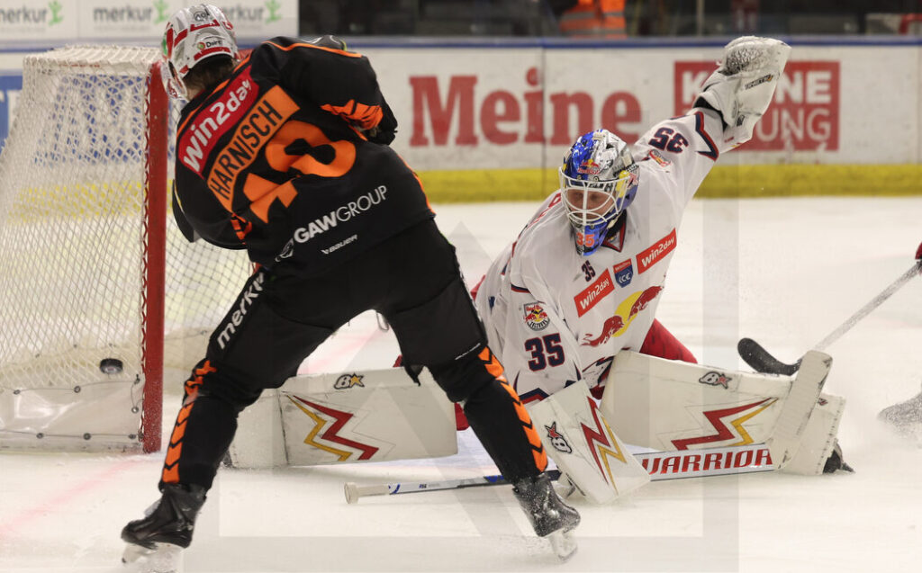 GRAZ, AUSTRIA, 14, Nov, 2025, Moser Medical Graz99ers vs. EC Red Bull Salzburg. Image shows Tim HARNISCH #40 (Moser Medical Graz99ers) & Atte TOLVANEN #35 (EC Red Bull Salzburg). Photo: Werner Krainbucher/ Puckfans.at