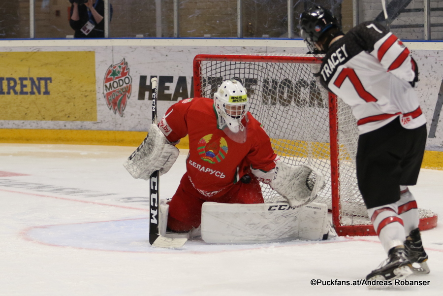 IIHF U18 World Championship 2019, BLR – CAN 21. April 2019 900 × 601 IIHF U18 World Championship 2019, BLR – CAN IIHF U18 World Championship 2019, BLR – CAN Rostislav Zinovenko #1, Brayden Tracey #7 A3 Arena, Umea ©Puckfans.at/Andreas Robanser