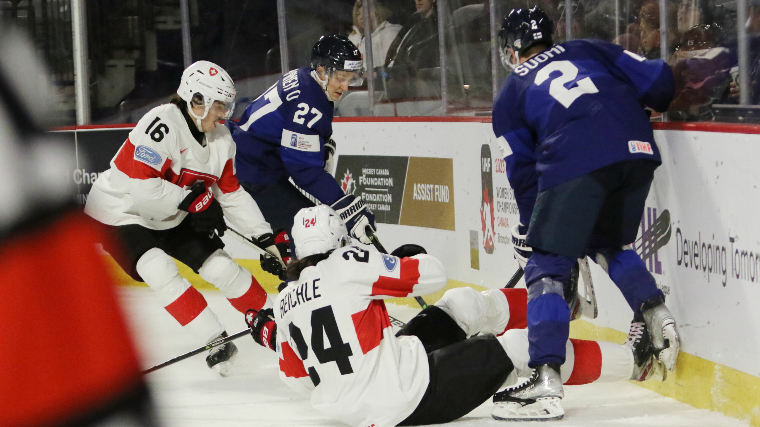 6T4A0439 26. Dezember 2022 2560 × 1440 6T4A0439 IIHF World Juniors 2023 FIN – SUI Livio Curdin Truog #16, Konsta Kapanen #27, Liekit Reichle #24, Jimi Suomi #2 Avenir Centre, Moncon, © Puckfans.at / Andreas Robanser