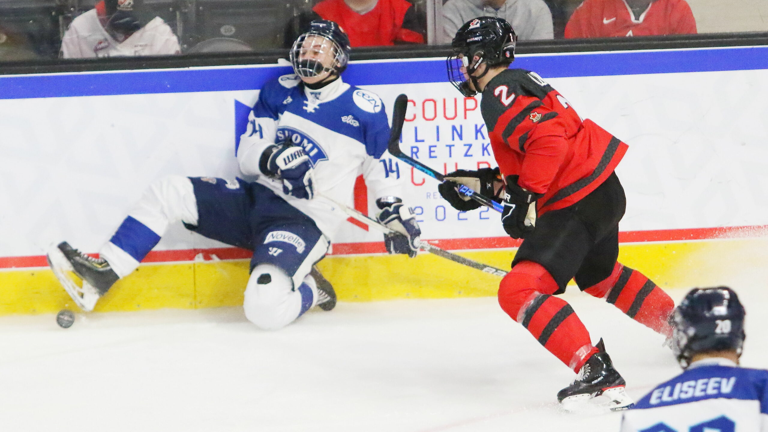 6T4A0443 6. August 2022 2560 × 1440 6T4A0443 Hlinka Gretzky Cup 2022, Semifinal CAN – FIN Aatu Pohjalainen #14, Cameron Allen #2 Peavey Mart Centrium, Red Deer © Puckfans.at/Andreas Robanser