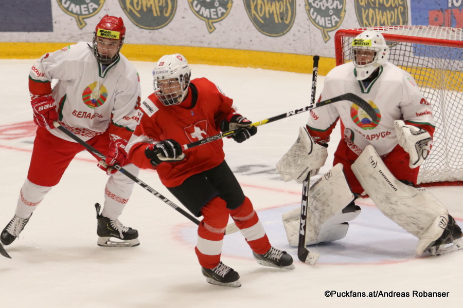 IIHF U18 World Championship 2019, SUI – BLR 22. April 2019 900 × 600 IIHF U18 World Championship 2019, SUI – BLR IIHF U18 World Championship 2019, SUI – BLR Yves Stoffel #23, Alexei Kolosov #30 A3 Arena, Umea ©Puckfans.at/Andreas Robanser