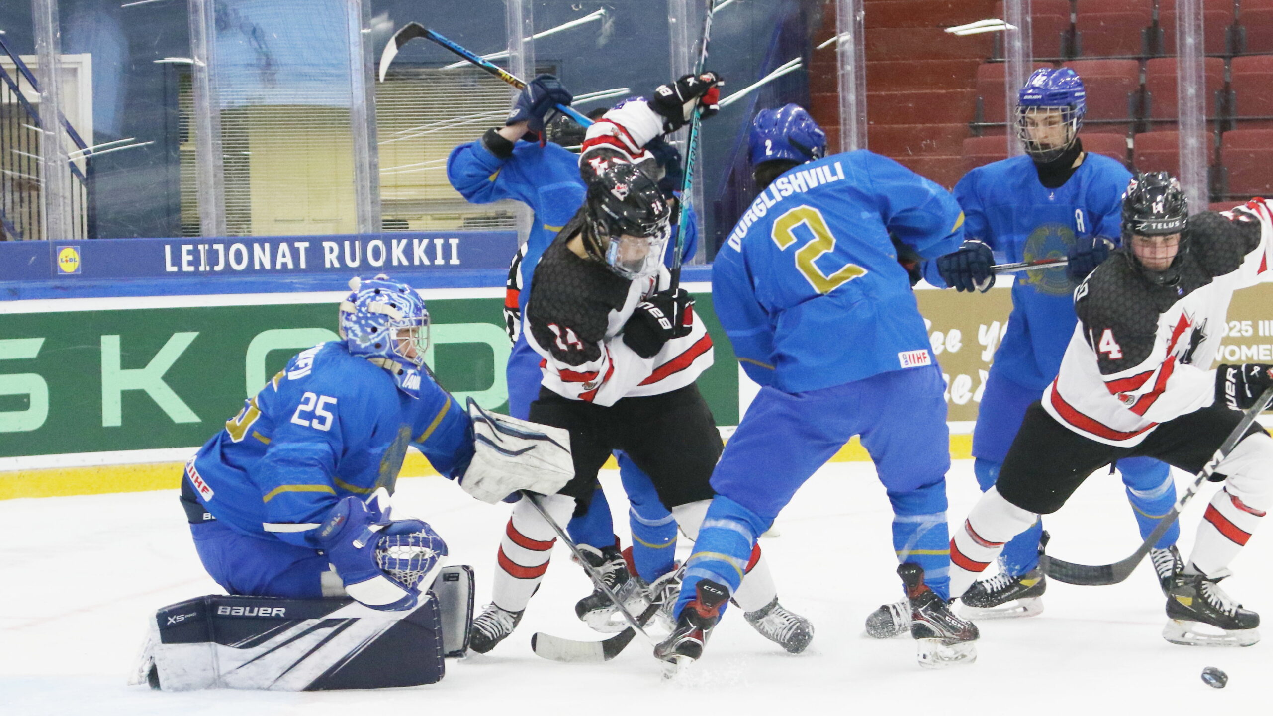 6T4A0686 30. April 2024 2560 × 1440 6T4A0686 IIHF U18 World Championship 2024 KAZ – CAN Tanirkhan Alpysbayev #25, Tij Iginla #24, Raty Durglishvili #2, Jett Luchanko #14 Trio Arena, Vantaa FIN © Puckfans.at / Andreas Robanser