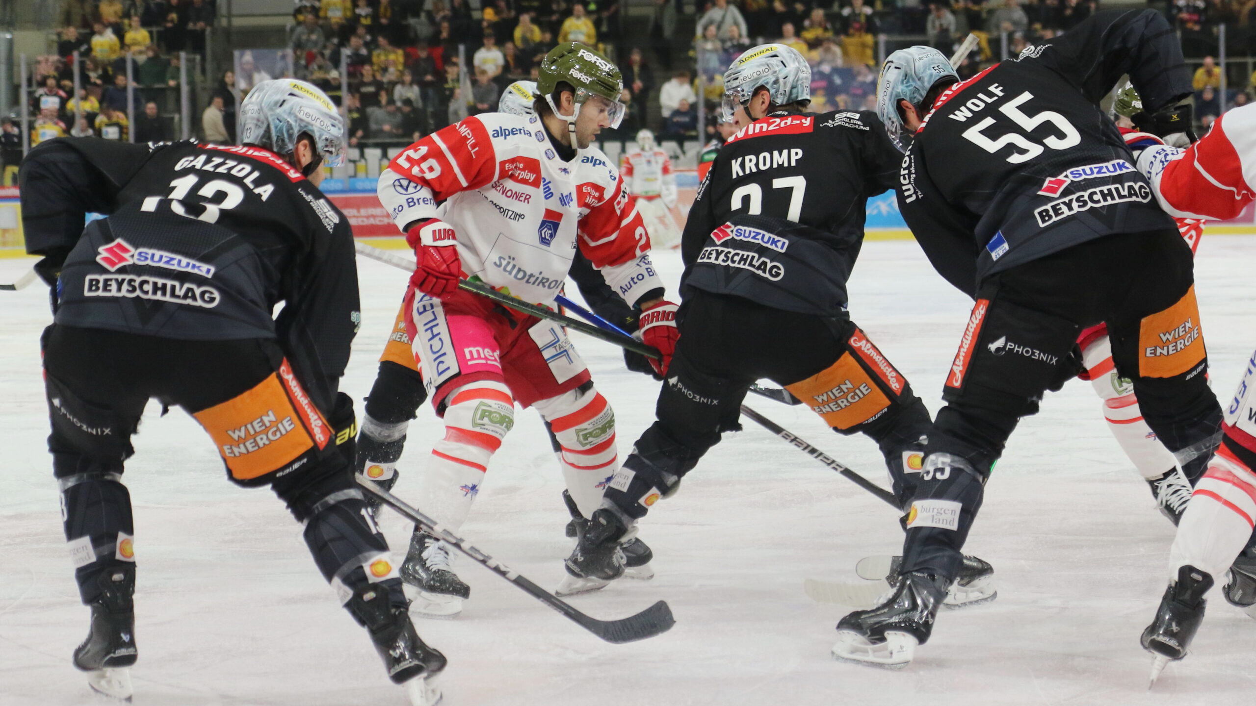 6T4A0796 5. Dezember 2025 2560 × 1440 6T4A0796 Randy Gazzola #13, Shane Gersich #29, vic-27 #27, Raphael Wolf #55, ICEHL Round 27 Vienna Capitals – HCB Südtirol, © Puckfans.at / Andreas Robanser