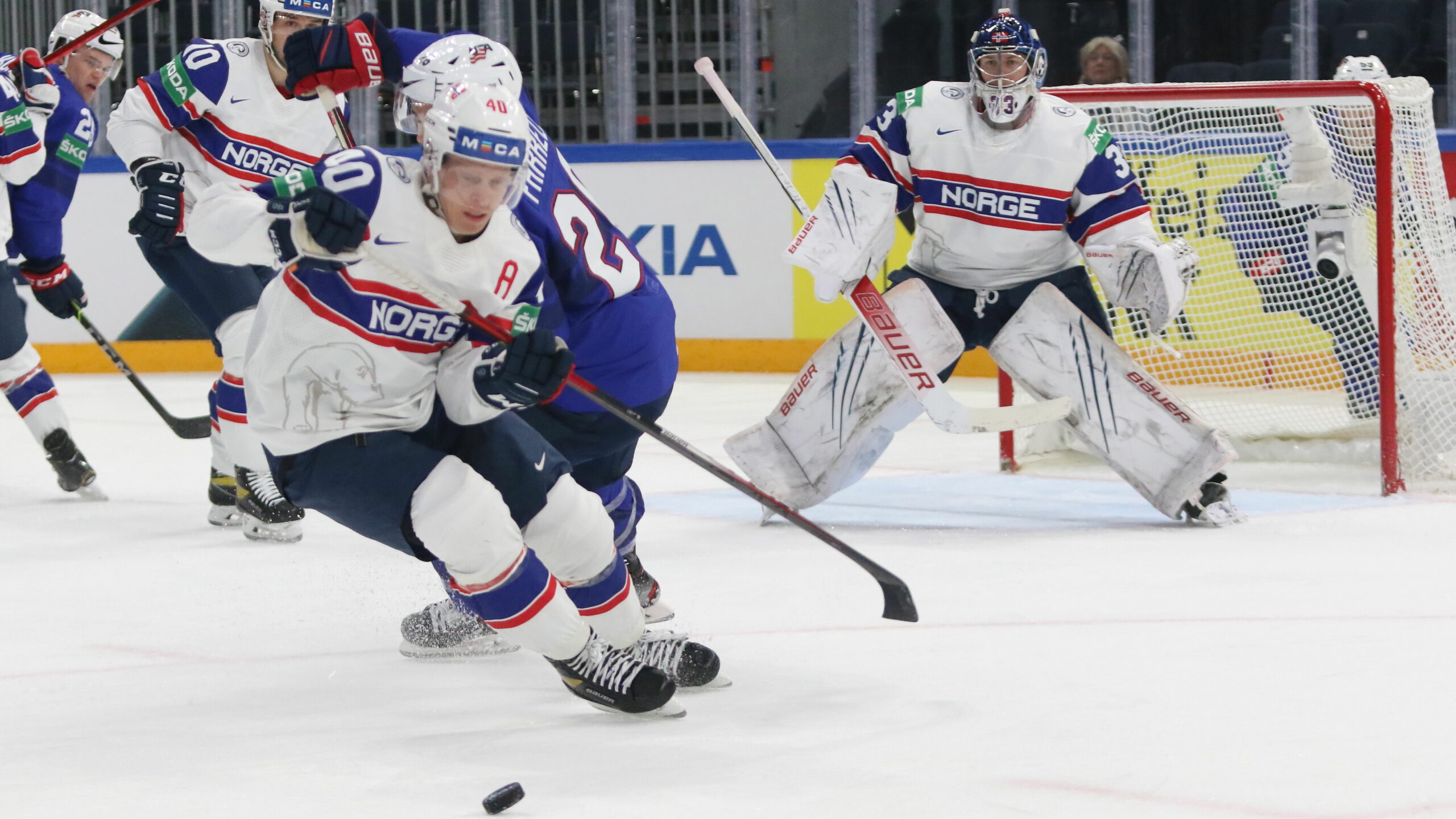 6T4A1681 24. Mai 2022 2560 × 1440 6T4A1681 IIHF Ice Hockey World Championship 2022, USA – NOR Ken Andre Olimb #40, Sean Farrell #26 Nokia Arena, Tampere © Puckfans.at/Andreas Robanser