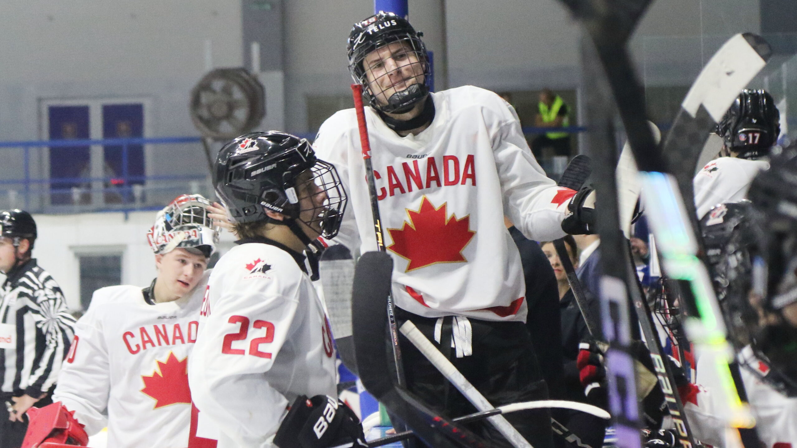 6T4A2145 9. August 2025 2560 × 1440 6T4A2145 Jean-Christoph Lemieux #22, Ethan Belchetz #16, Pre Game Hlinka Gretzky Cup 2025, SVK – CAN, ZS Piestany, © Puckfans.at / Andreas Robanser
