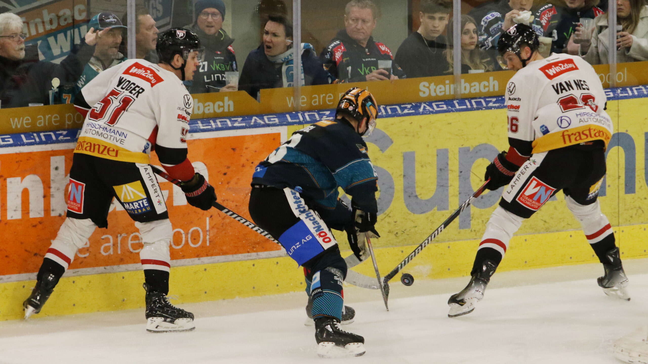 6T4A2251 13. Februar 2024 2560 × 1440 6T4A2251 ICEHL Round 48 Black Wings Linz – Pioneers Vorarlberg Daniel Woger #51, Gerd Kragl #13, Guus van Nes #26 Linz AG Eisarena, © Puckfans.at / Andreas Robanser