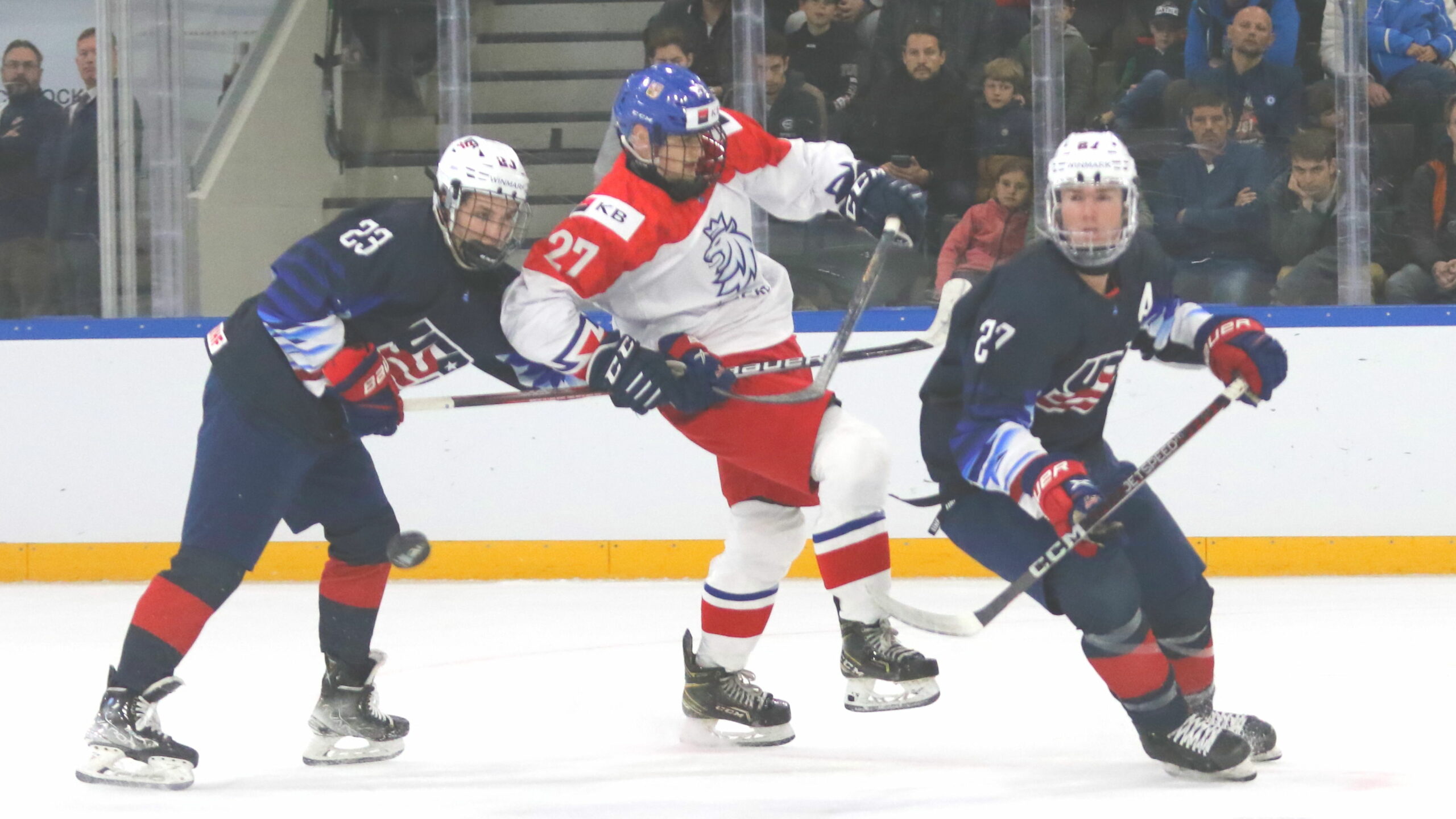6T4A2260 30. April 2022 2560 × 1440 6T4A2260 U18 IIHF World Championship Semi-Final USA – CZE Lane Hutson #23, Vojtech Polak #27 Fanatec Arena, Landshut © Puckfans.at/Andreas Robanser