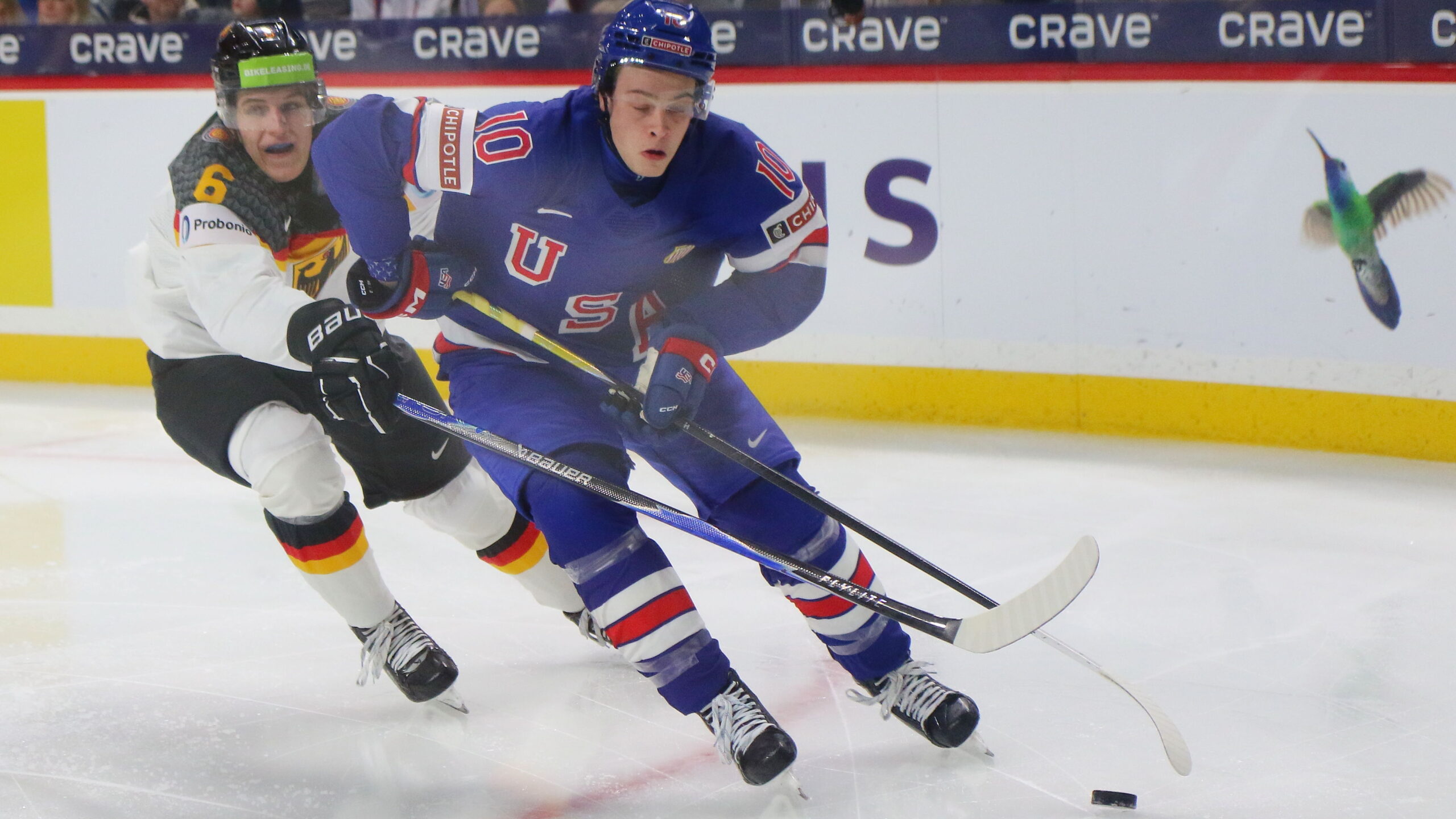 James Hagens #10, Manuel Schams #6, World Juniors 2026 GER – USA, Grand Casino Arena, Saint Paul © Puckfans.at / Andreas Robanser