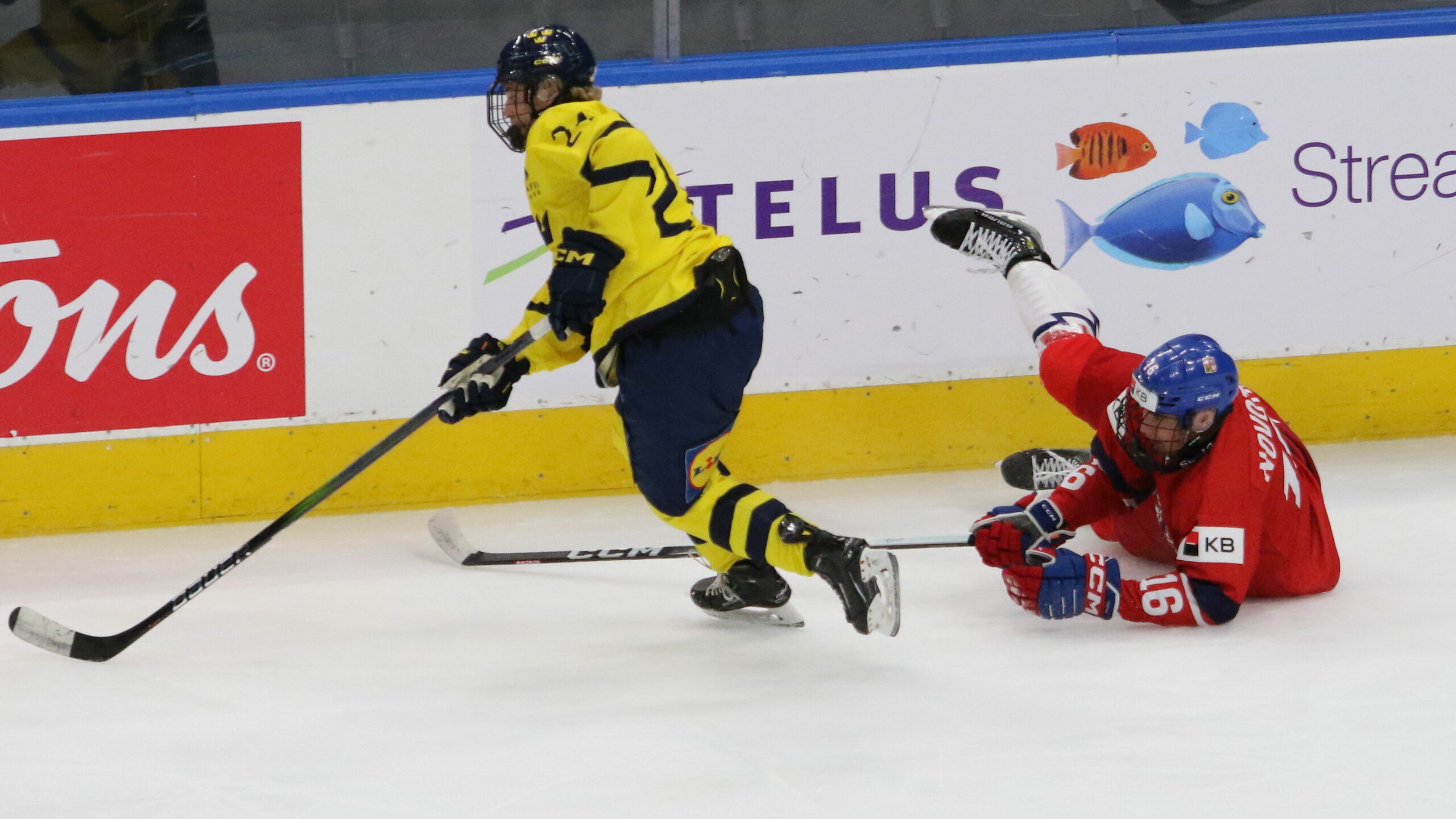 6T4A2359 10. August 2024 2560 × 1440 6T4A2359 Hlinka Gretzky Cup 2024 SF SWE – CZE Jonas Lagerberg Hoen #24, Adam Novotny #16 Rogers Place Edmonton, © Puckfans.at / Andreas Robanser