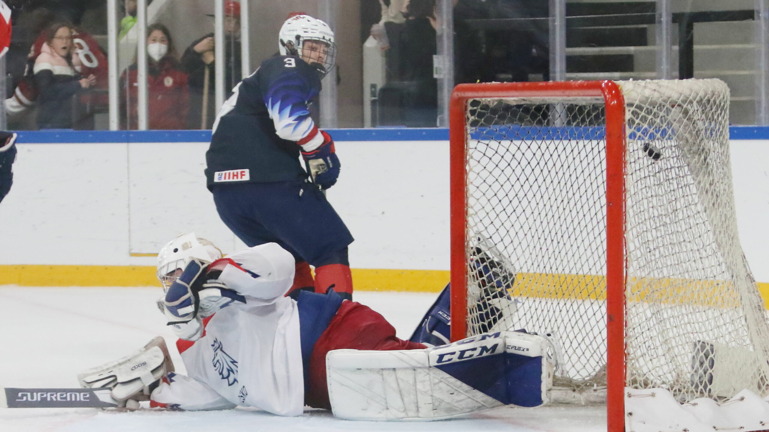 6T4A2408 30. April 2022 2560 × 1440 6T4A2408 U18 IIHF World Championship Semi-Final USA – CZE Isaac Howard #3, Michael Schnattinger #1 Fanatec Arena, Landshut © Puckfans.at/Andreas Robanser