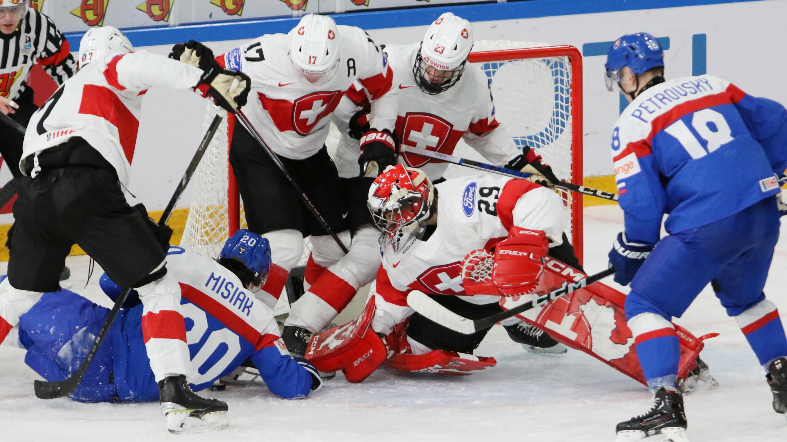 6T4A2415 27. Dezember 2023 2560 × 1440 6T4A2415 IIHF World Juniors 2024 SVK – SUI, Timo Bünzli #7, Martin Misiak #20, Alessio Beglieri #29, Miles Müller #17, Leon Muggli #23, Servác Petrovský #18 Frolundaborg Arena, © Puckfans.at / Andreas Robanser