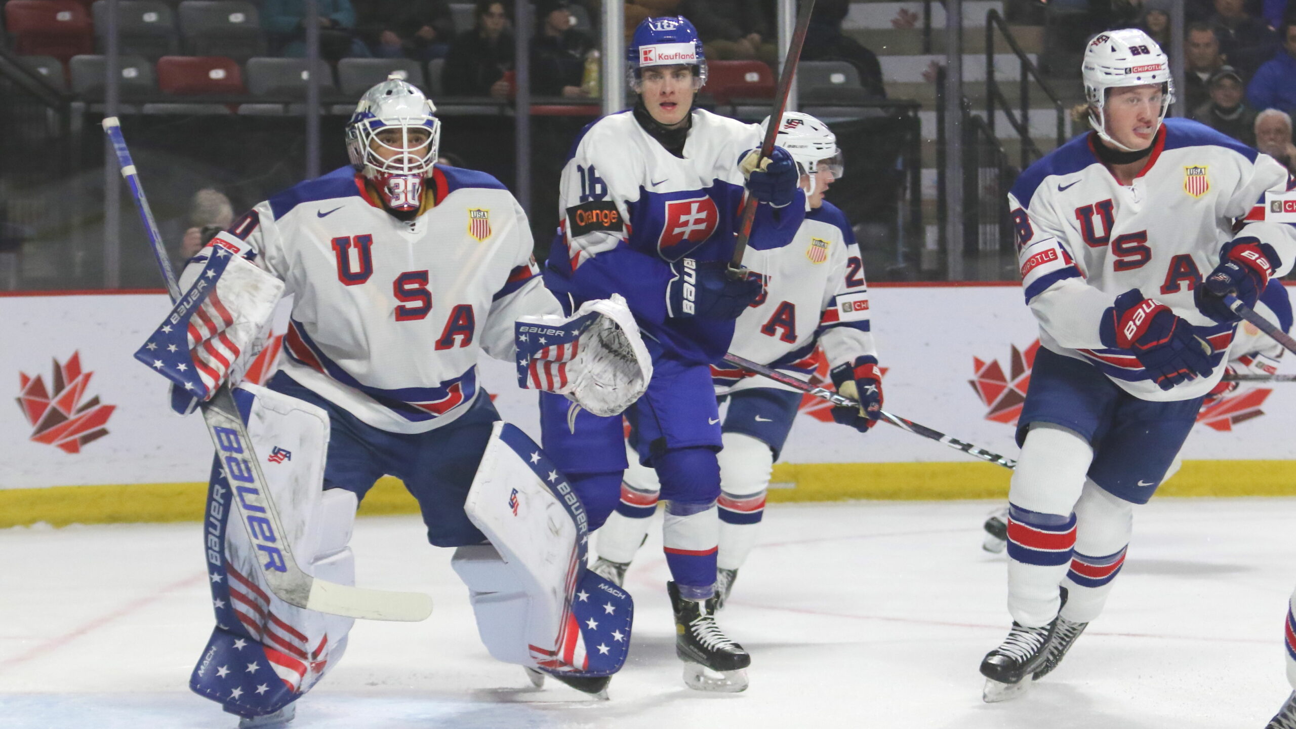 6T4A2852 29. Dezember 2022 2560 × 1440 6T4A2852 IIHF World Juniors 2023 SVK – USA Kaidan Mbereko #30, Charlie Stramel #28 Avenir Centre, Moncon, © Puckfans.at / Andreas Robanser