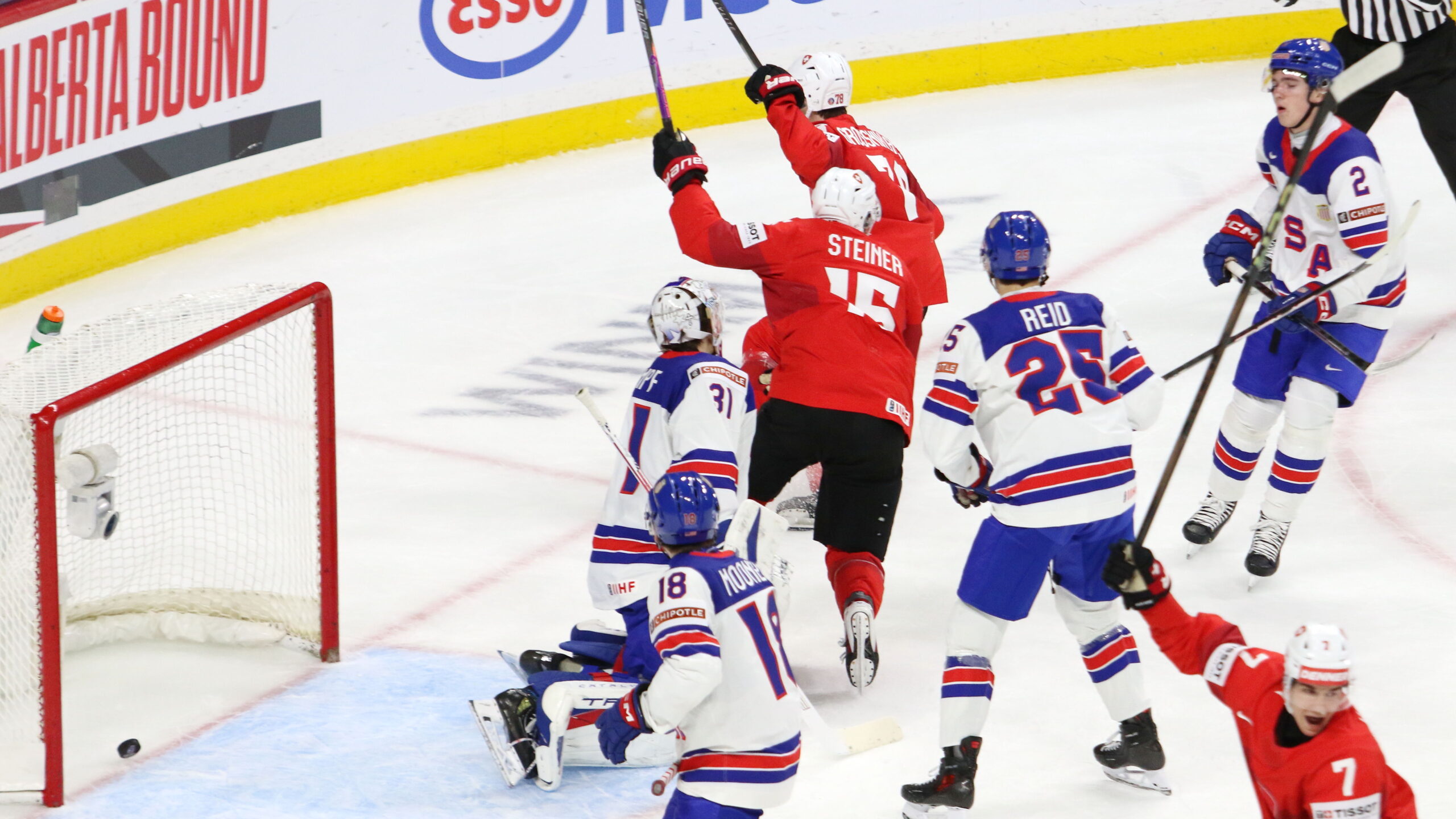 Nicholas Kempf #31, L.J. Mooney #18, Lars Steiner #15, Joel Grossniklaus #78, Chase Reid #25, Luke Osburn #2, Cyrill Henry #7, World Juniors 2026 USA – SUI, Grand Casino Arena, Saint Paul © Puckfans.at / Andreas Robanser