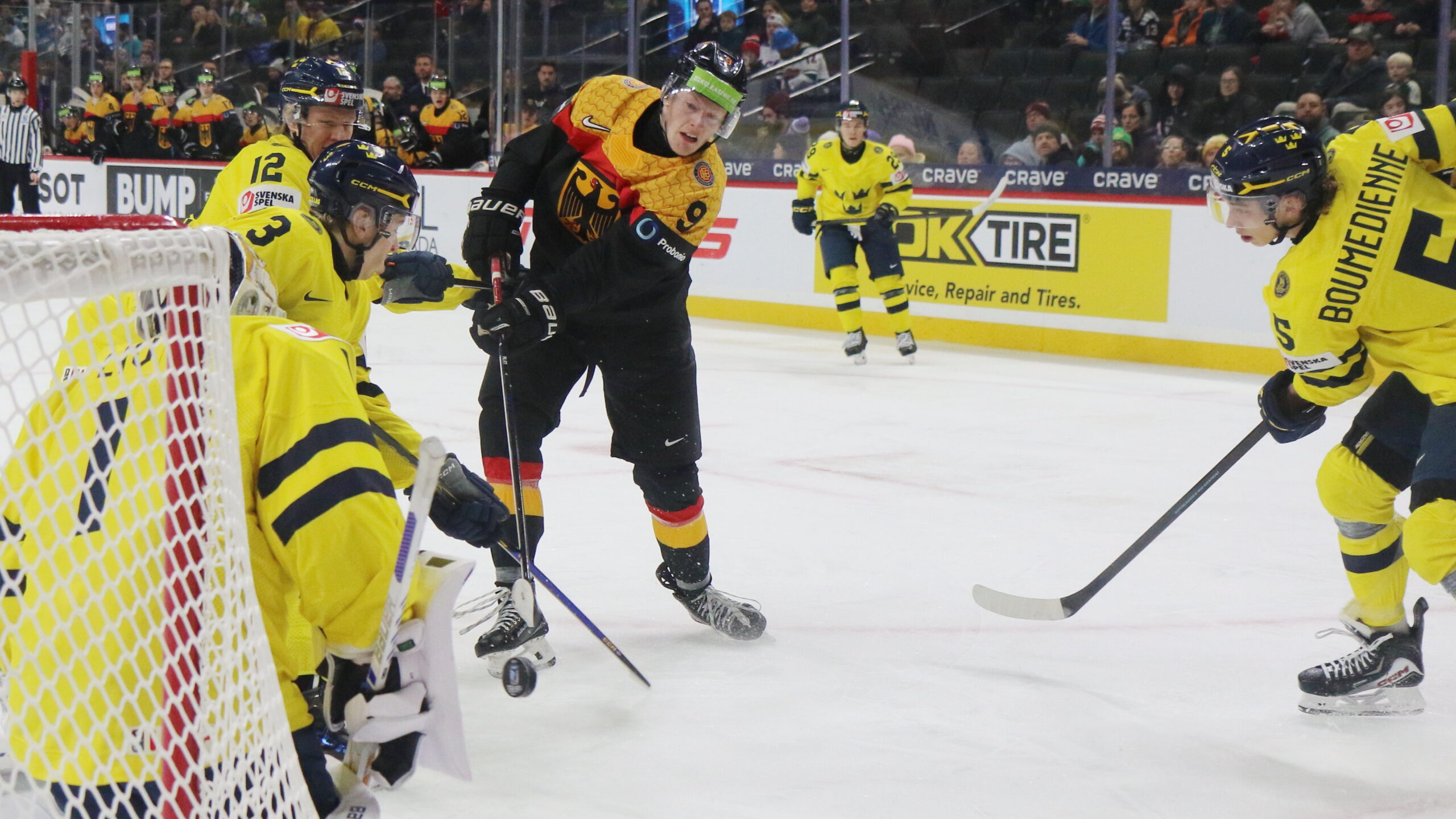 Herman Liv #1, Milton Gästrin #12, Elias Pul #9, Sascha Boumedienne #5, World Juniors 2026 GER – SWE, Grand Casino Arena, Saint Paul © Puckfans.at / Andreas Robanser