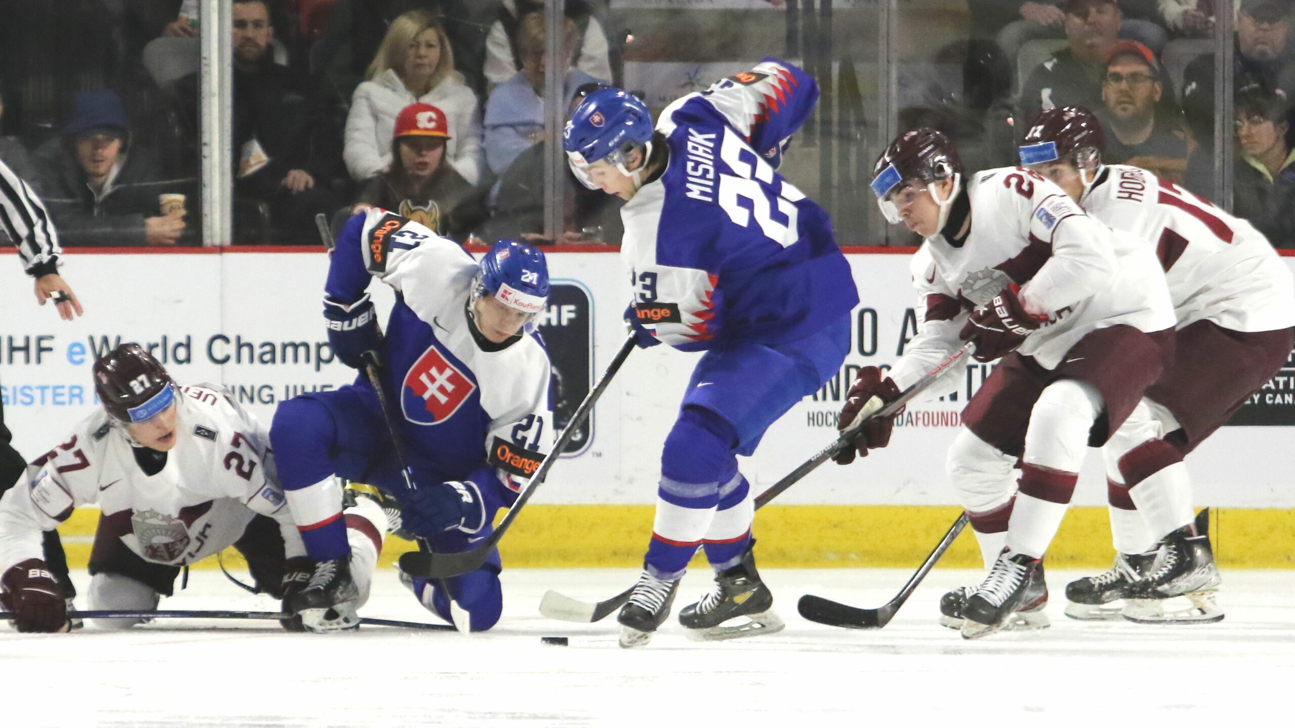 6T4A3955 30. Dezember 2022 2560 × 1440 6T4A3955 IIHF World Juniors 2023 SVK – LAT Klavs Veinbergs #27, Peter Repcik #21, Alex Ciernik #22, Edgars Kazaks #28 Avenir Centre, Moncon, © Puckfans.at / Andreas Robanser