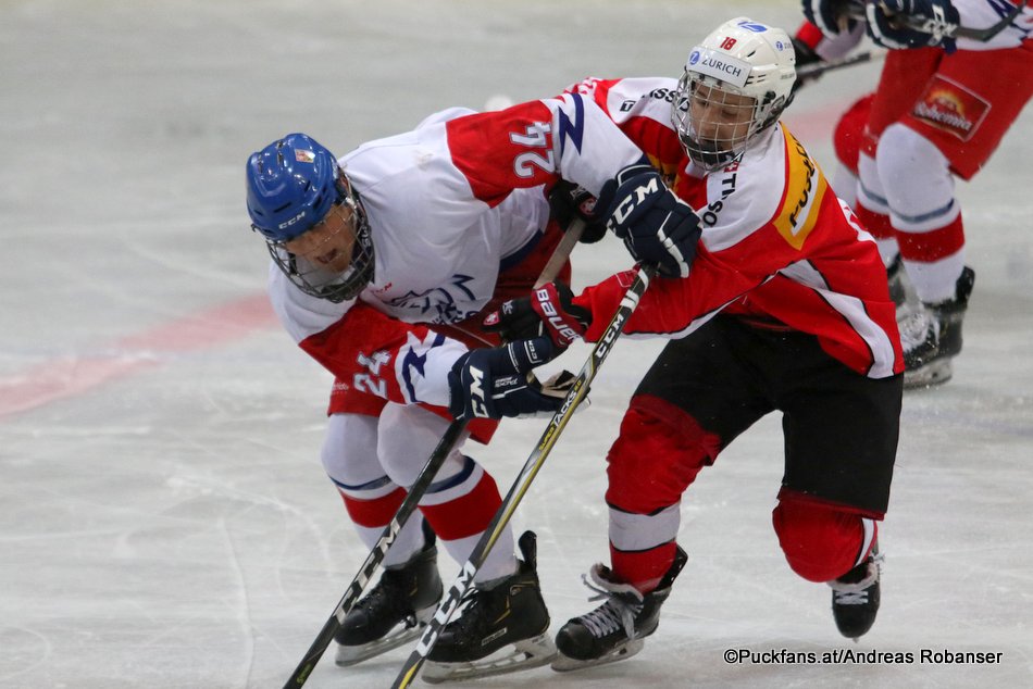 6T4A4174 6. August 2019 950 × 634 6T4A4174 Hlinka Gretzky Cup 2019, CZE – SUI Dominik Binias #24, Mike Zaugg #18 Zimni Stadion, Breclav ©Puckfans.at/Andreas Robanser