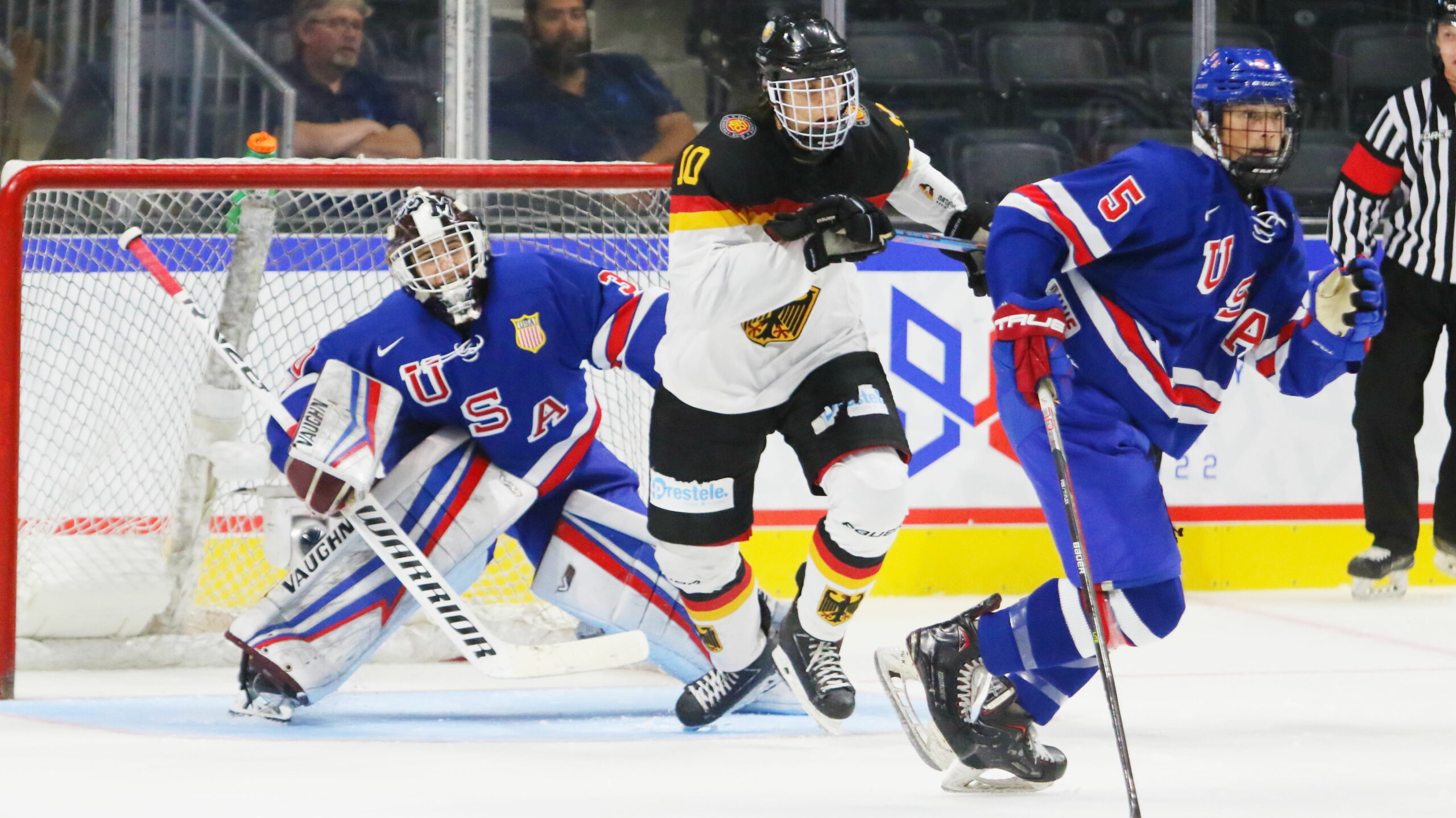6T4A4975 1. August 2022 2560 × 1440 6T4A4975 Hlinka Gretzky Cup 2022 USA – GER Calvin Vachon #30, Timo Ruckdaschel #10, Michael Hagens #5 Peavey Mart Centrium, Red Deer © Puckfans.at/Andreas Robanser