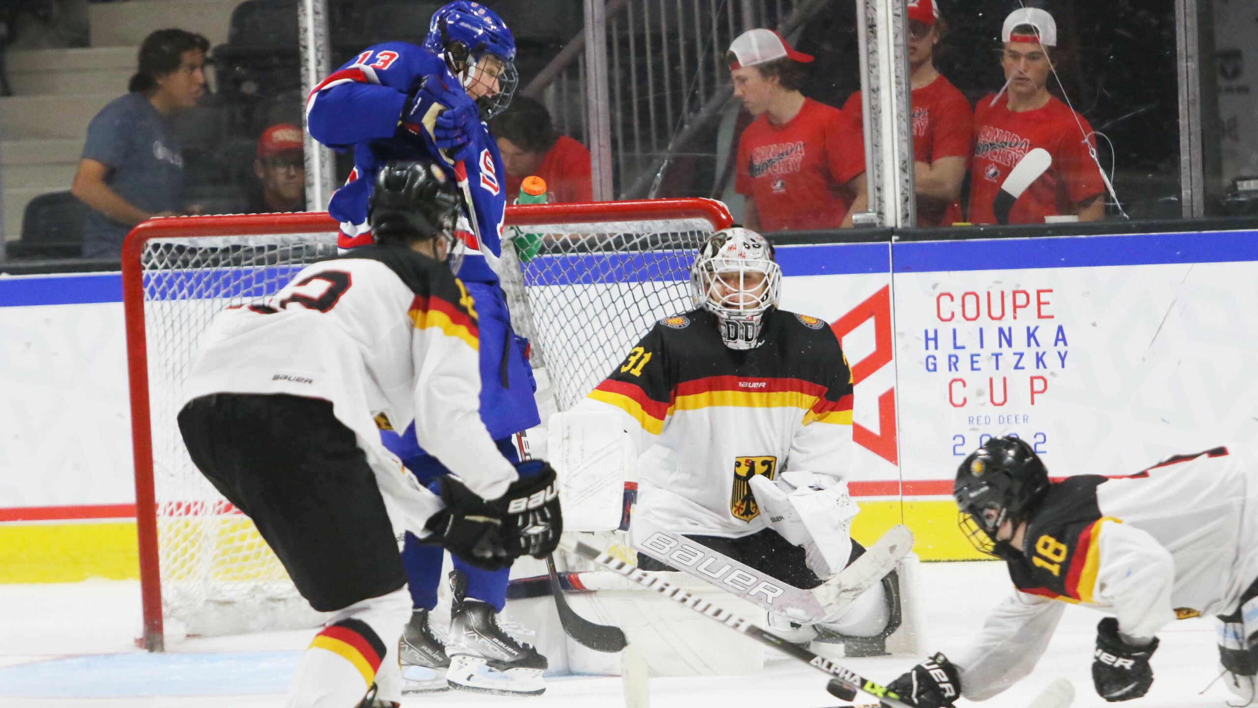 6T4A5005 1. August 2022 2560 × 1440 6T4A5005 Hlinka Gretzky Cup 2022 USA – GER A.J. Lacroix #13, Dean Doge #31, Lua Niehus #18 Peavey Mart Centrium, Red Deer © Puckfans.at/Andreas Robanser