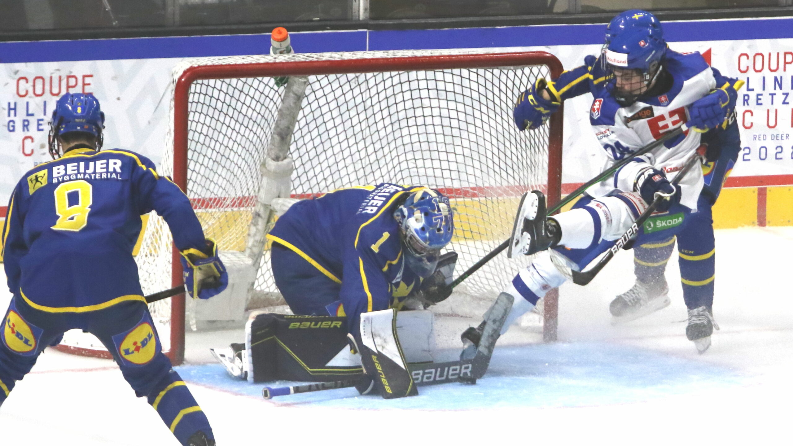 6T4A5775 1. August 2022 2560 × 1440 6T4A5775 Hlinka Gretzky Cup 2022 SWE – SVK Arvid Bergström #8, Noah Erliden #1, Adam Cedzo #24 Peavey Mart Centrium, Red Deer © Puckfans.at/Andreas Robanser