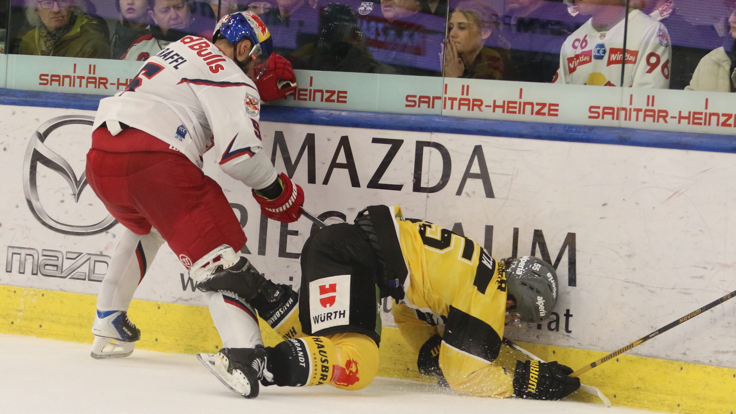 Thomas Raffl #5, Luca Zanatta #55, ICEHL Playoff QF Game 3 EC Red Bull Salzburg – HC Pustertal, Eisarena Salzburg, © Puckfans.at / Andreas Robanser
