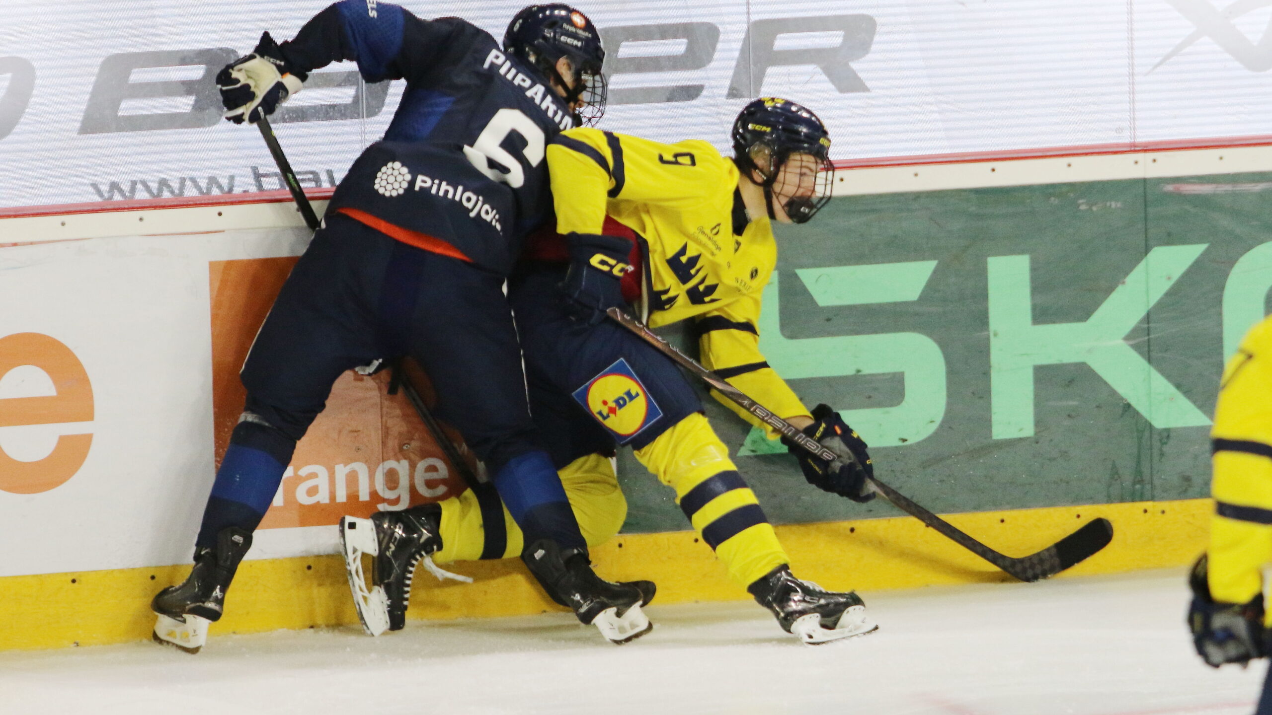 Juho Piiparinen #6, Theodor Knights #9, Hlinka Gretzky Cup 2025, Semifinal SWE – FIN, Pavol Demitra Arena, Trencin © Puckfans.at / Andreas Robanser
