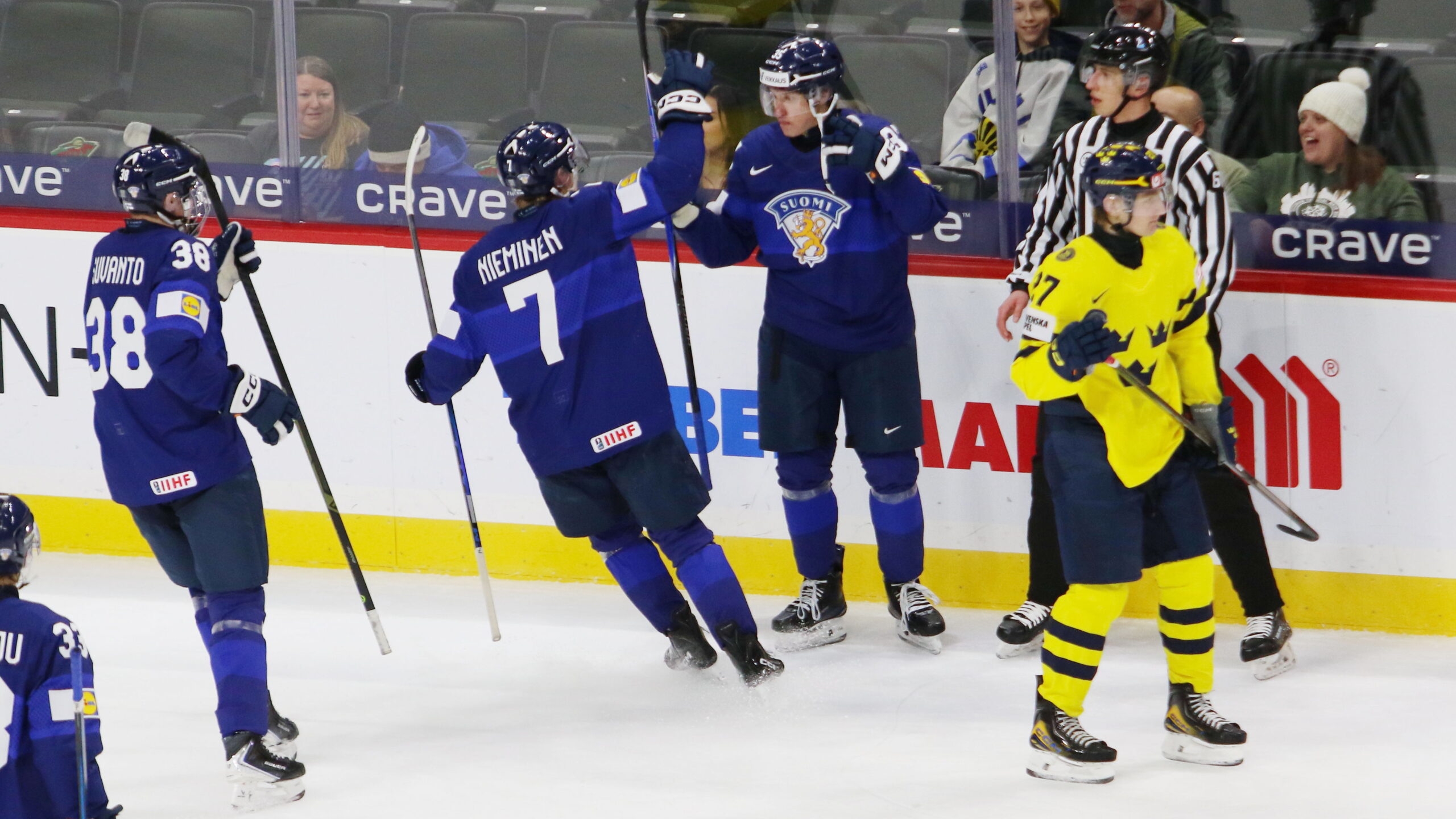 Oliver Suvanto #38, Daniel Nieminen #7, Atte Joki #35, Wilson Björck #27, World Juniors 2026 SF SWE – FIN, Grand Casino Arena, Saint Paul © Puckfans.at / Andreas Robanser