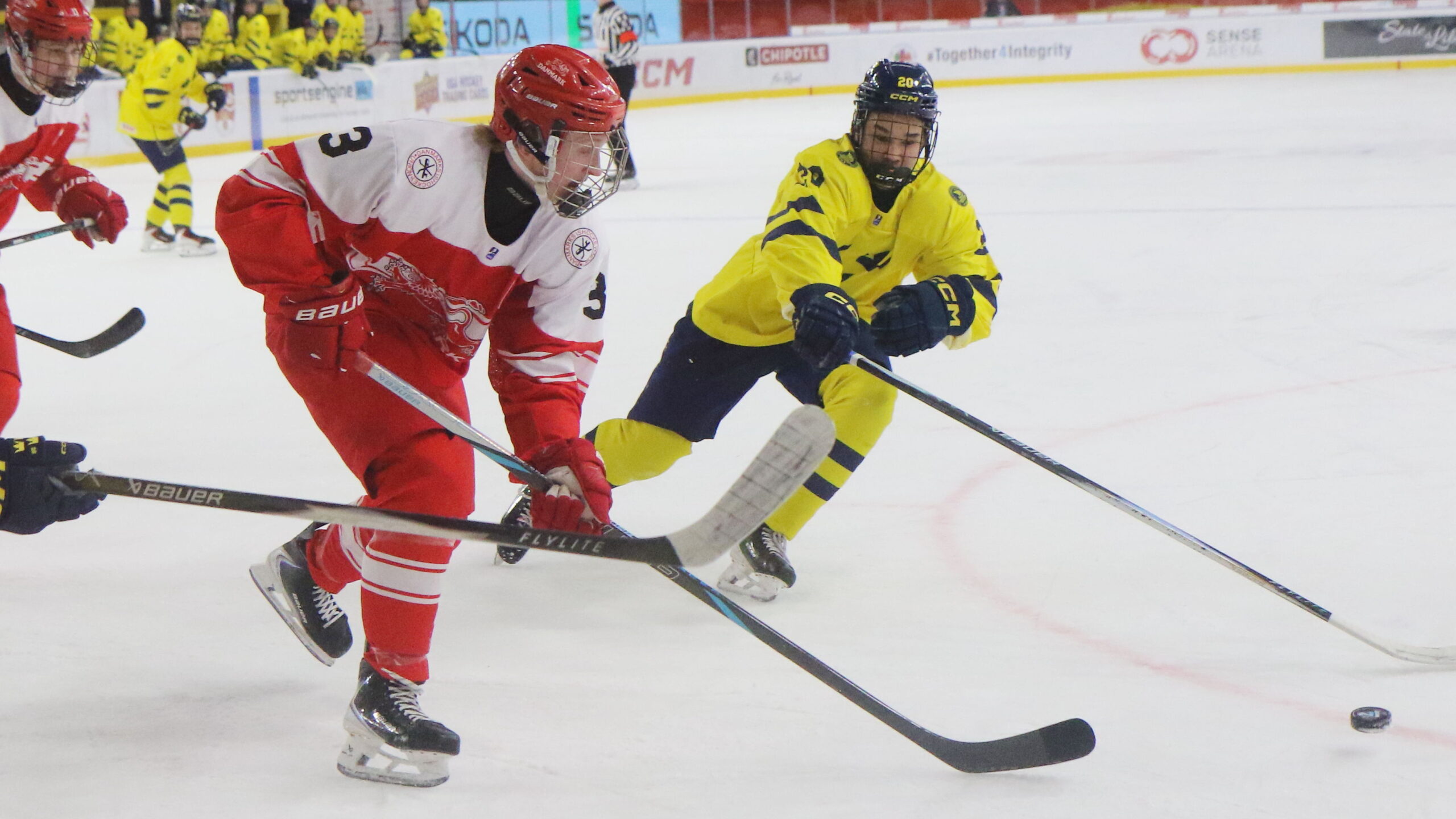 Lucas Kjelgaard Larsen #3, Mikael Kim #20, IIHF U18 World Championship 2026 DEN – SWE, Vladimír Dzurilla Arena, Bratislava, © Puckfans.at / Andreas Robanser