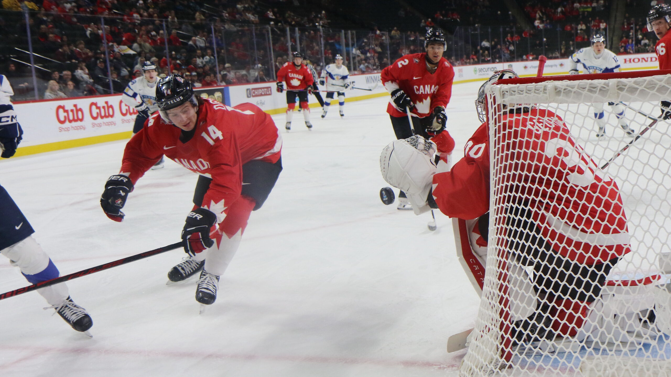 Ben Danford #14, Kashawn Aitcheson #2, Carter George #30, World Juniors 2026 Bronze Game CAN – FIN, Grand Casino Arena, Saint Paul © Puckfans.at / Andreas Robanser