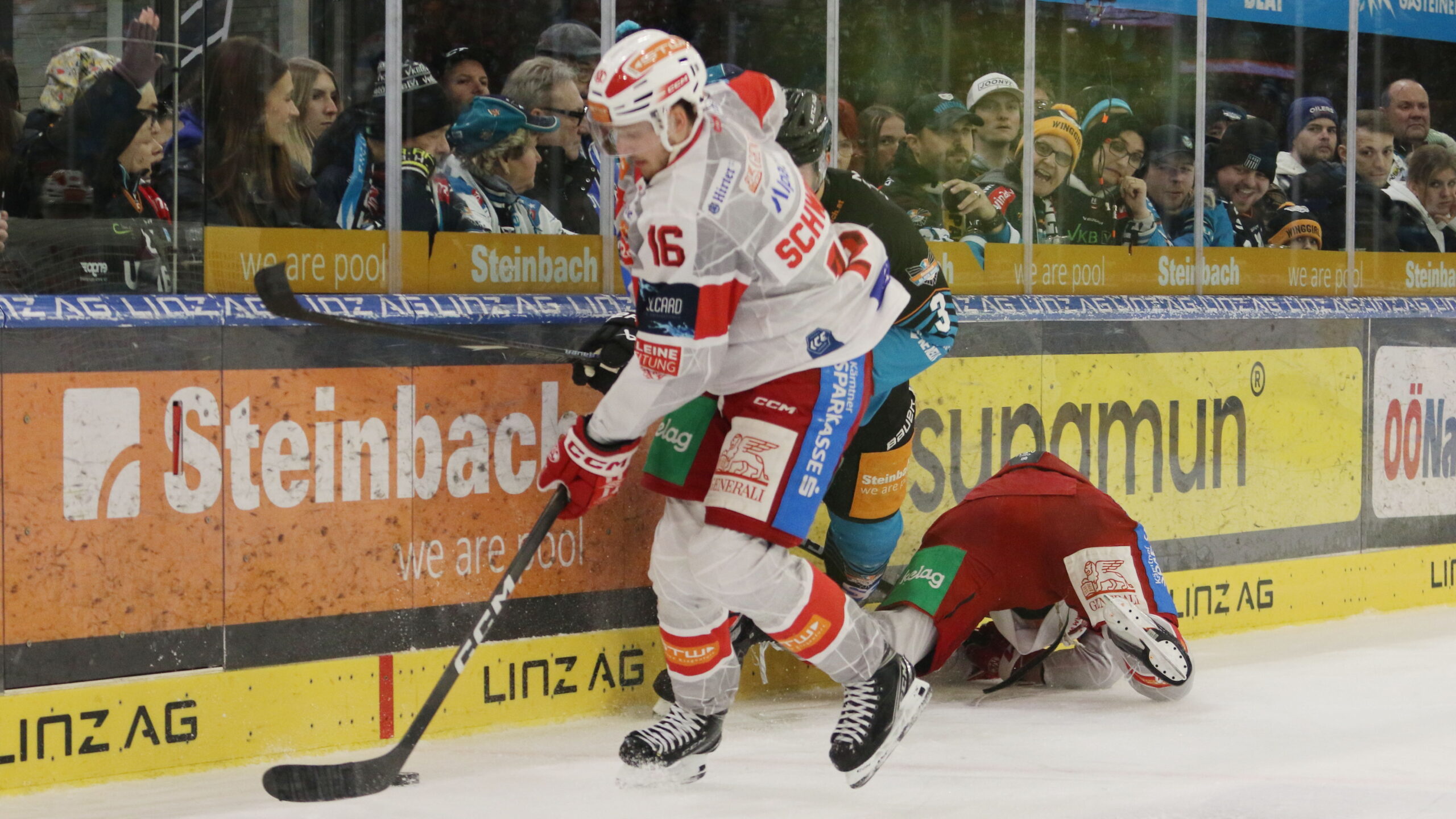 Simeon Schwinger #16, Greg Moro #3, ICEHL Round 41 Black Wings Linz – EC KAC, Linz AG Eisarena, © Puckfans.at / Andreas Robanser