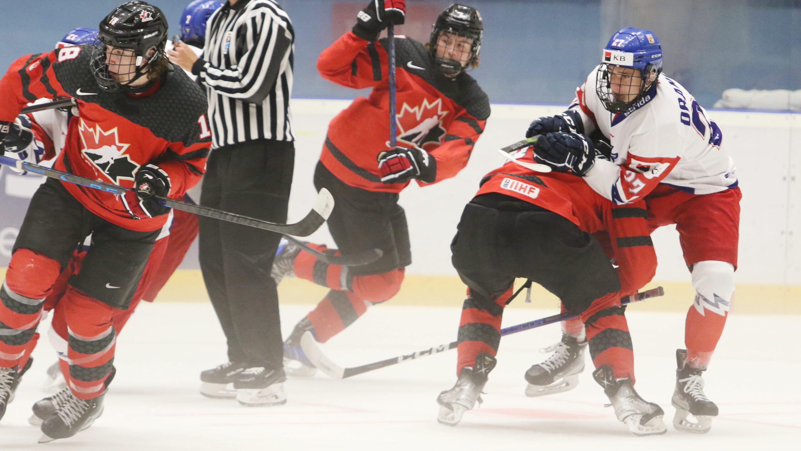 6T4A8291 5. August 2023 2560 × 1440 6T4A8291 Hlinka Gretzky Cup Final CAN – CZE Liam Greentree #18, Samuel Drancak #27 Zimni Stadion, Breclav © Puckfans.at / Andreas Robanser