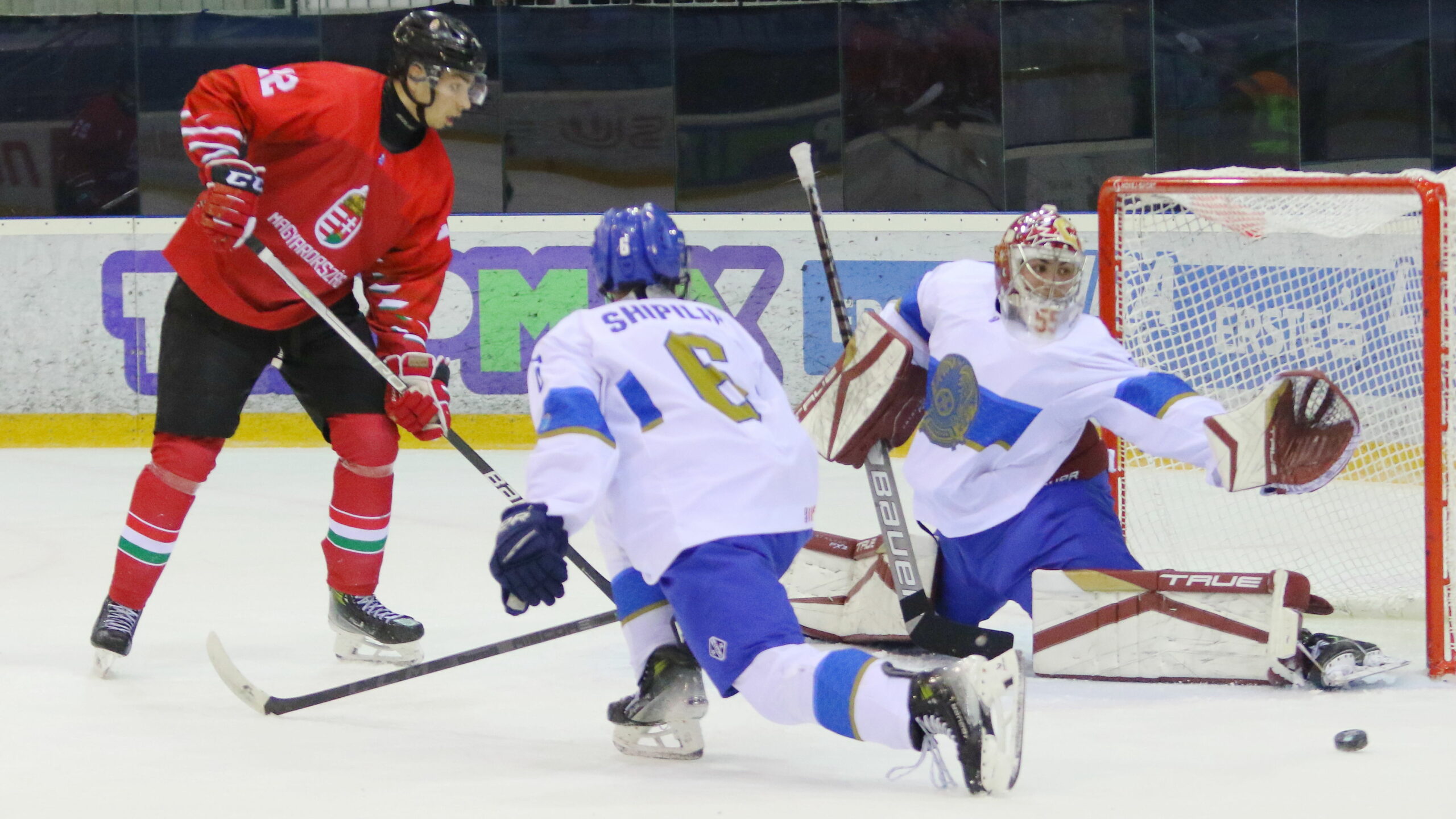 6T4A8505 10. Dezember 2023 2560 × 1440 6T4A8505 U20 IIHF World Championship Div 1A KAZ – HUN Márk Weidemann #22, Mstislav Shipilin #6, Vladimir Nikitin #1 Tuskecsarnok Srena, Budapest, © Puckfans.at / Andreas Robanser