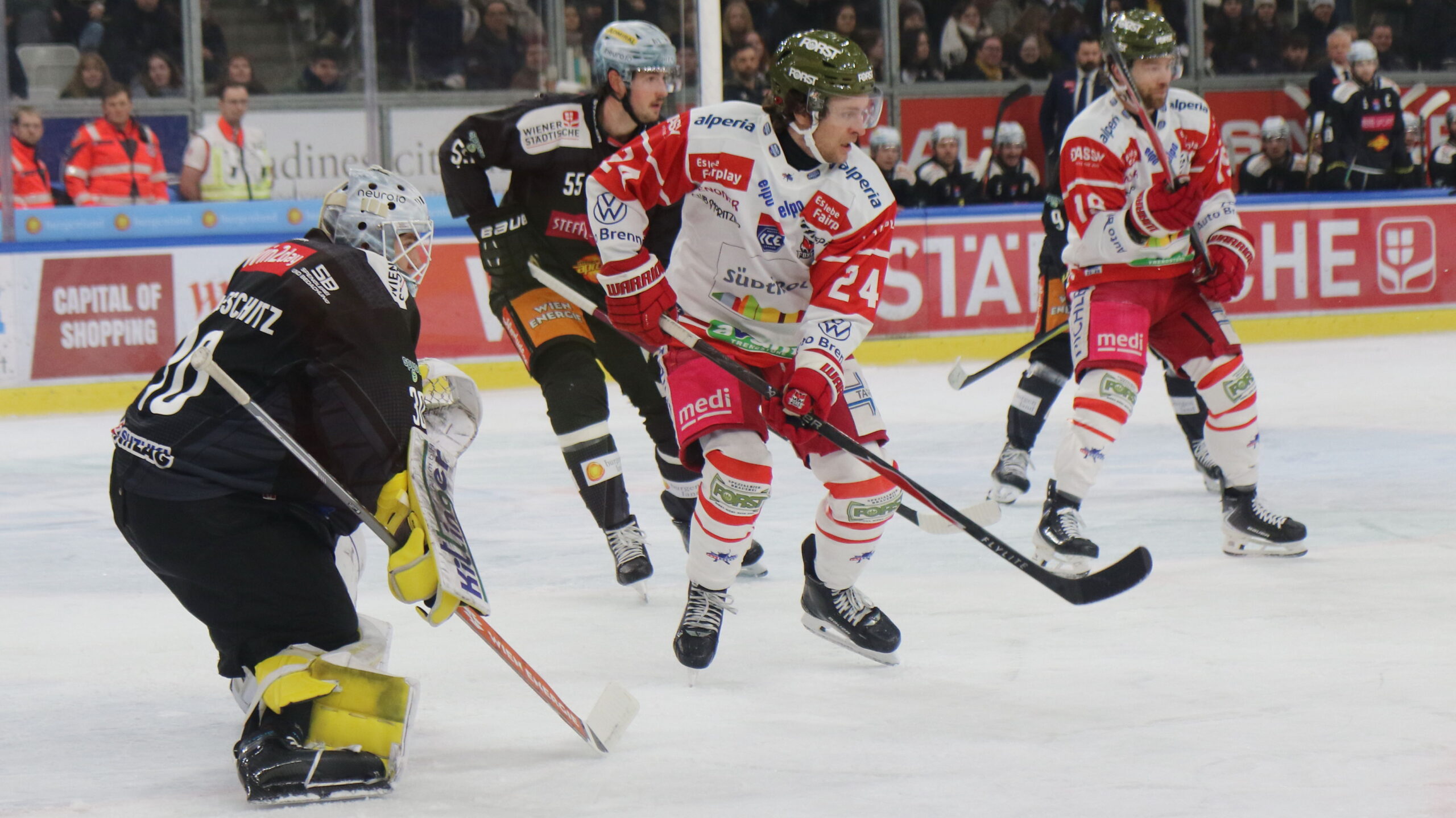 6T4A8510 25. Januar 2026 2560 × 1439 6T4A8510 Sebastian Wraneschitz #30, Raphael Wolf #55, Cole Schneider #24, Bryce Misley #18, ICEHL Round 43 Vienna Capitals – HCB Südtirol, Steffl Arena, © Puckfans.at / Andreas Robanser