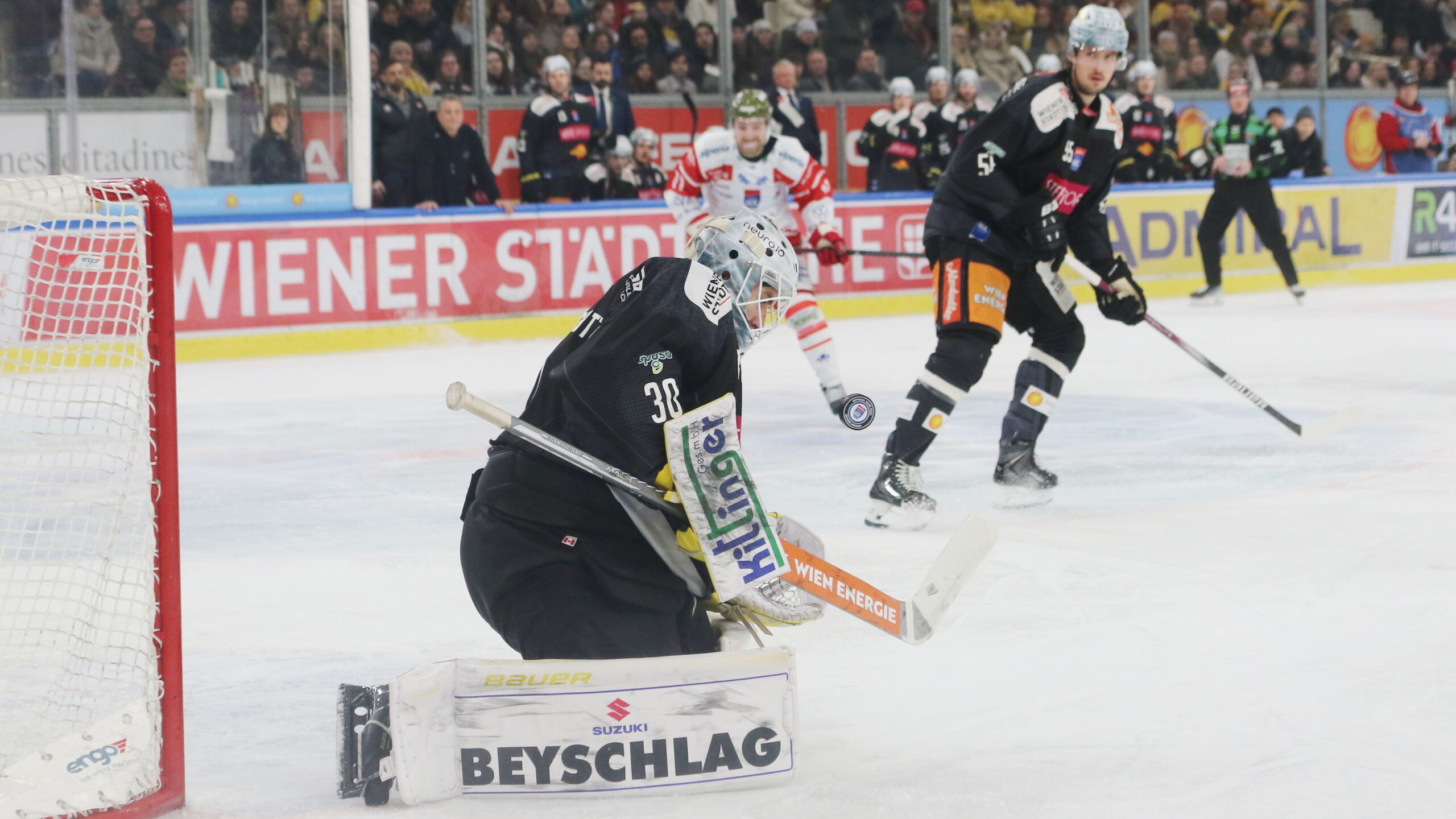 6T4A8729 25. Januar 2026 2560 × 1440 6T4A8729 Sebastian Wraneschitz #30, Raphael Wolf #55, ICEHL Round 43 Vienna Capitals – HCB Südtirol, Steffl Arena, © Puckfans.at / Andreas Robanser