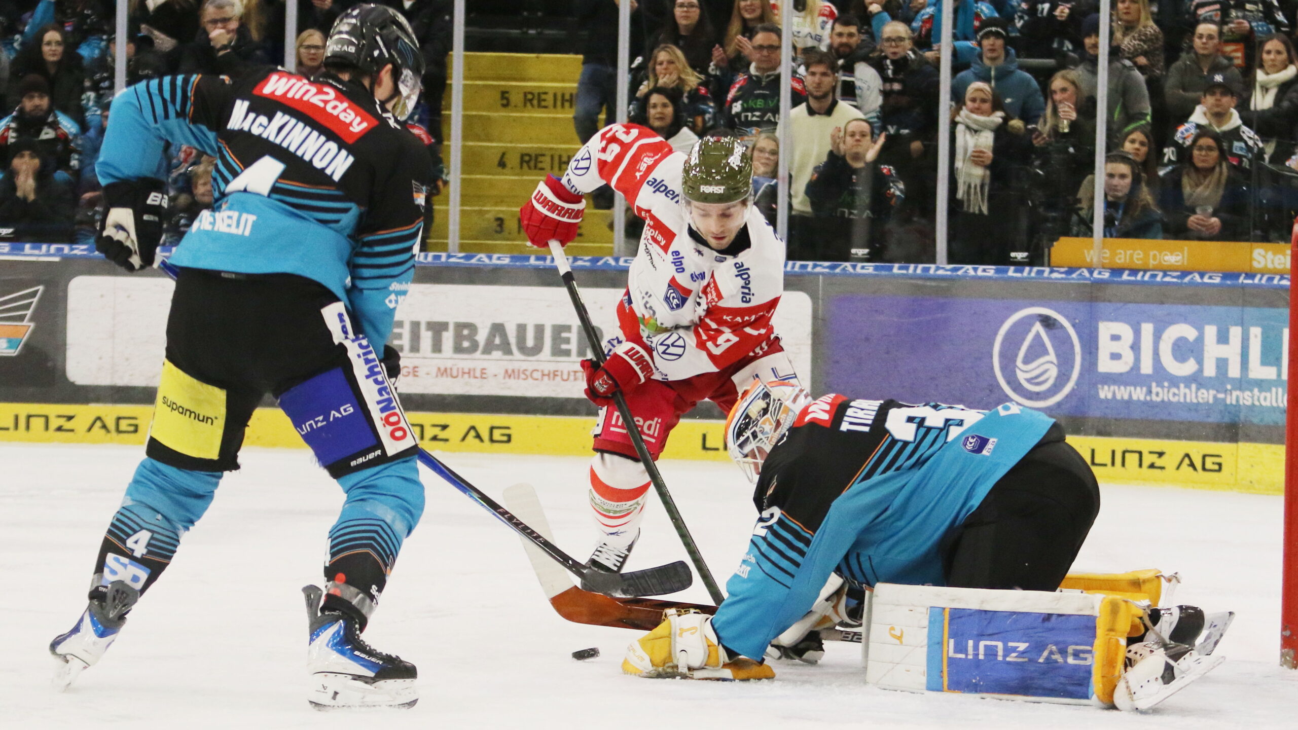 Ryan MacKinnon #4, Shane Gersich #29, Rasmus Tirronen #32, ICEHL Round 44 Black Wings Linz – HCB Südtirol, Linz AG Eisarena, © Puckfans.at / Andreas Robanser