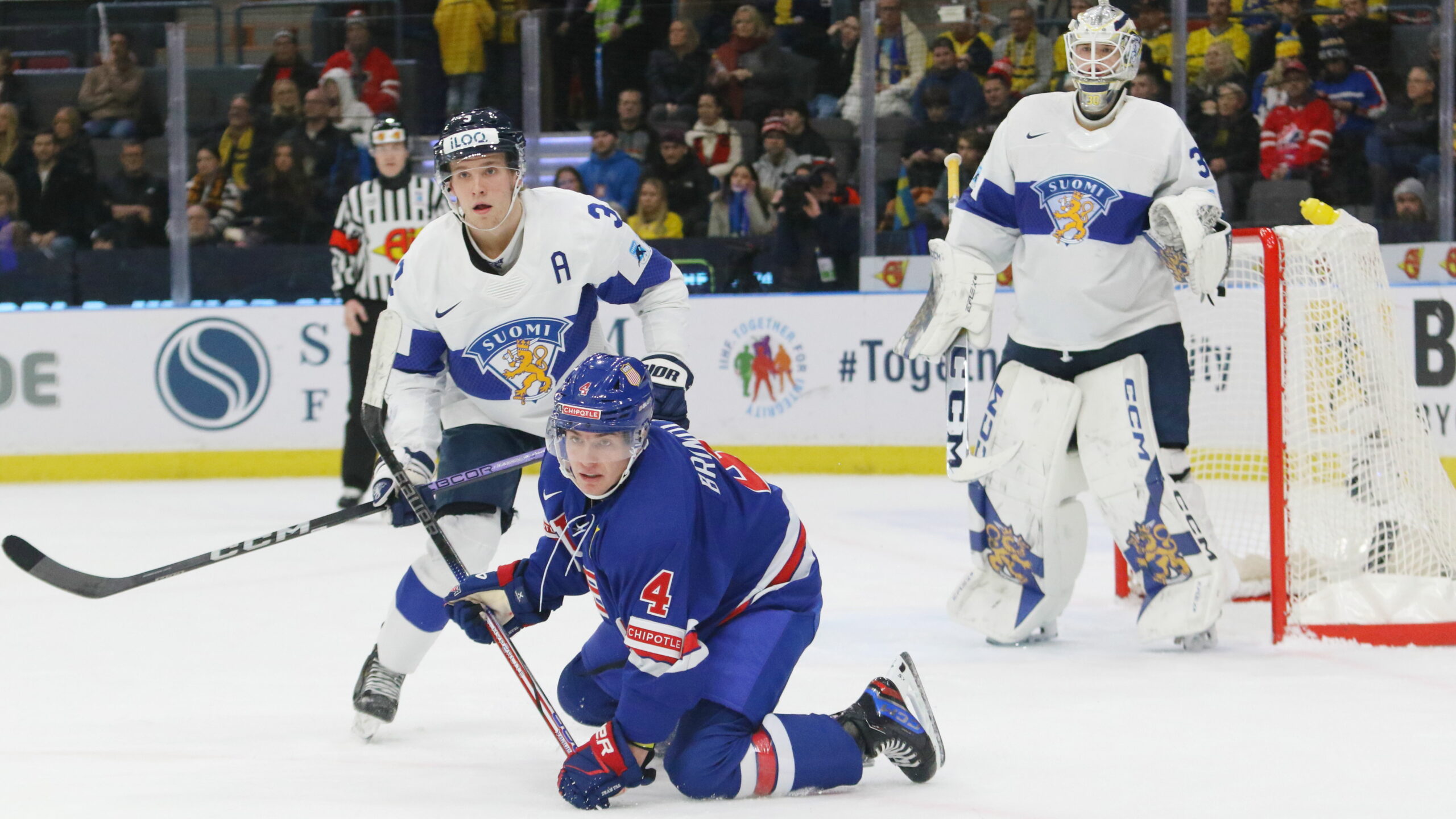 6T4A8817 4. Januar 2024 2560 × 1440 6T4A8817 IIHF World Juniors 2024 Semifinal USA – FIN Otto Salin #3, Gavin Brindley #4, Niklas Kokko #30 Arena Scandinavium, © Puckfans.at / Andreas Robanser