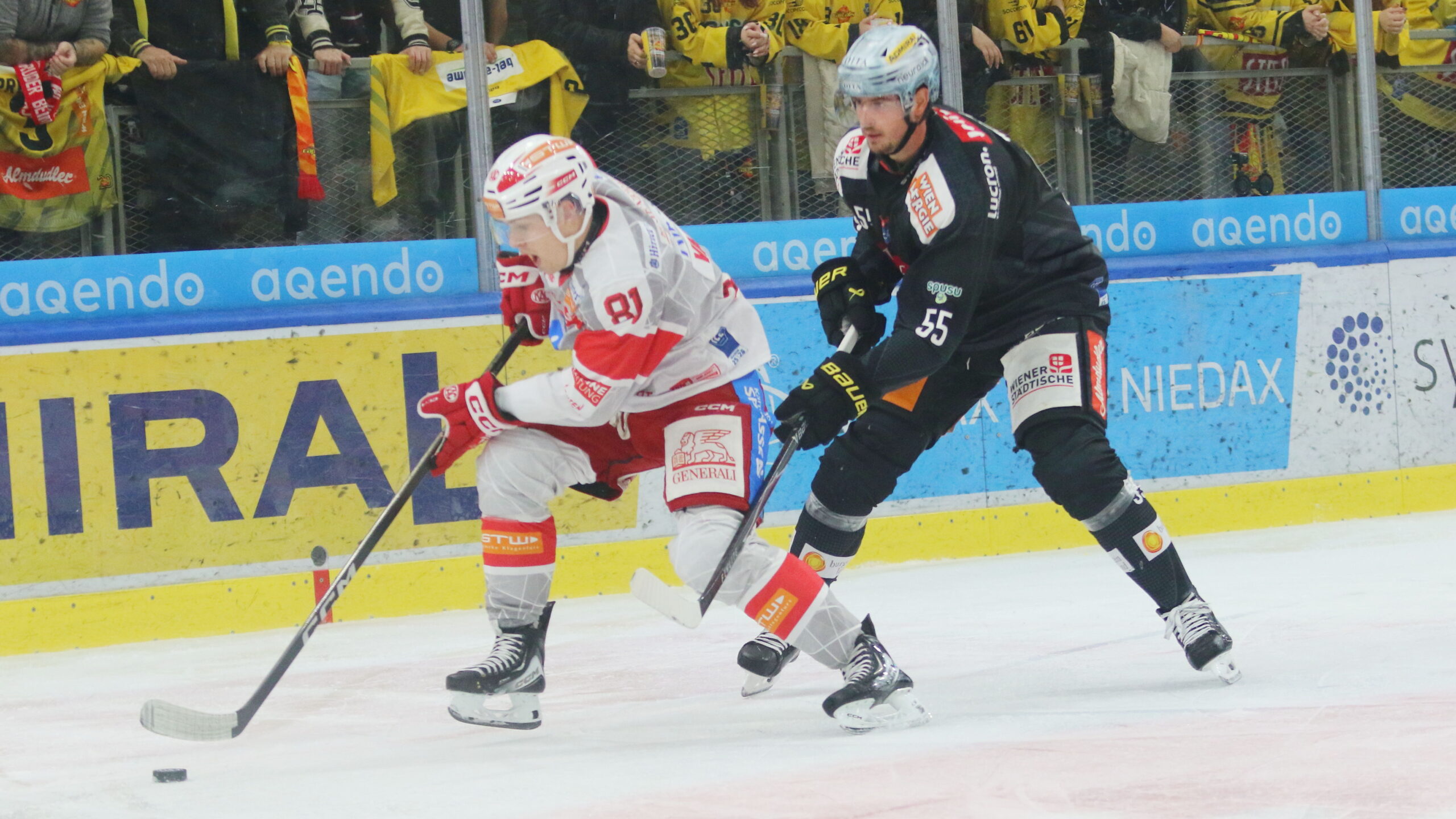 Finn van Ee #81, Raphael Wolf #55, ICEHL Round11 Vienna Capitals – EC KAC, Steffl Arena, © Puckfans.at / Andreas Robanser