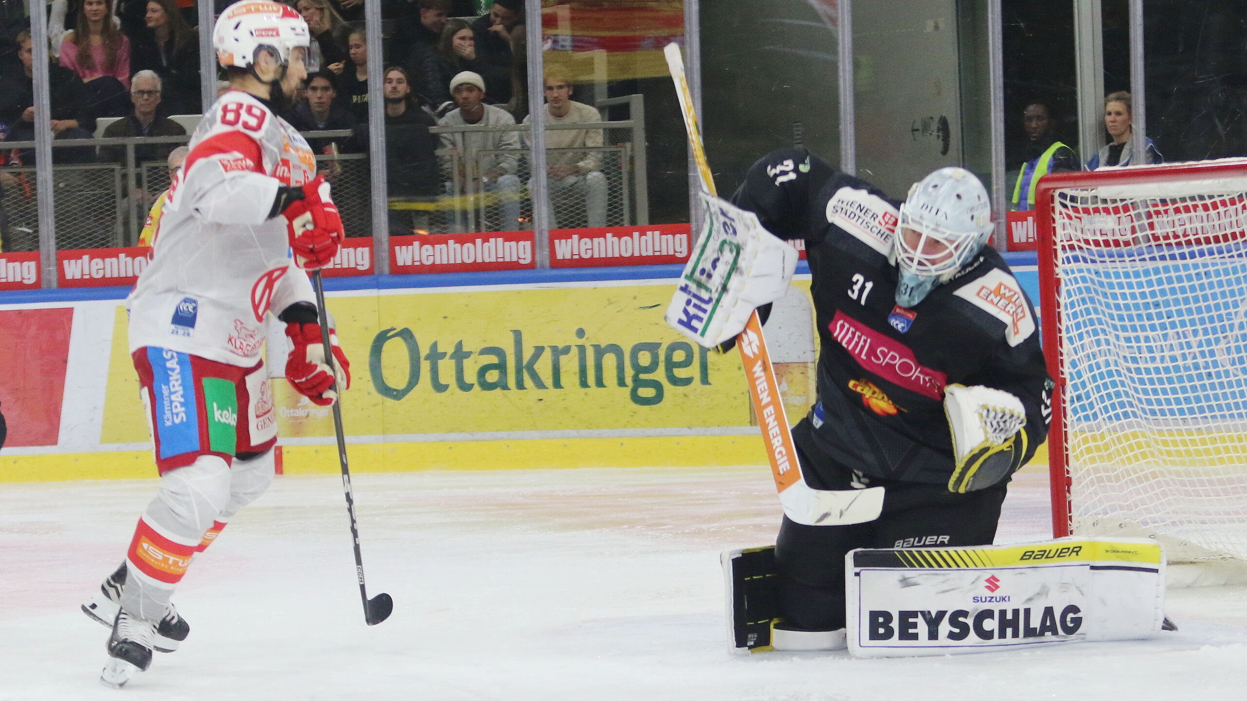 6T4A8966 17. Oktober 2025 2560 × 1440 6T4A8966 Raphael Herburger# 89, Evan Cowley #31, ICEHL Round11 Vienna Capitals – EC KAC, Steffl Arena, © Puckfans.at / Andreas Robanser
