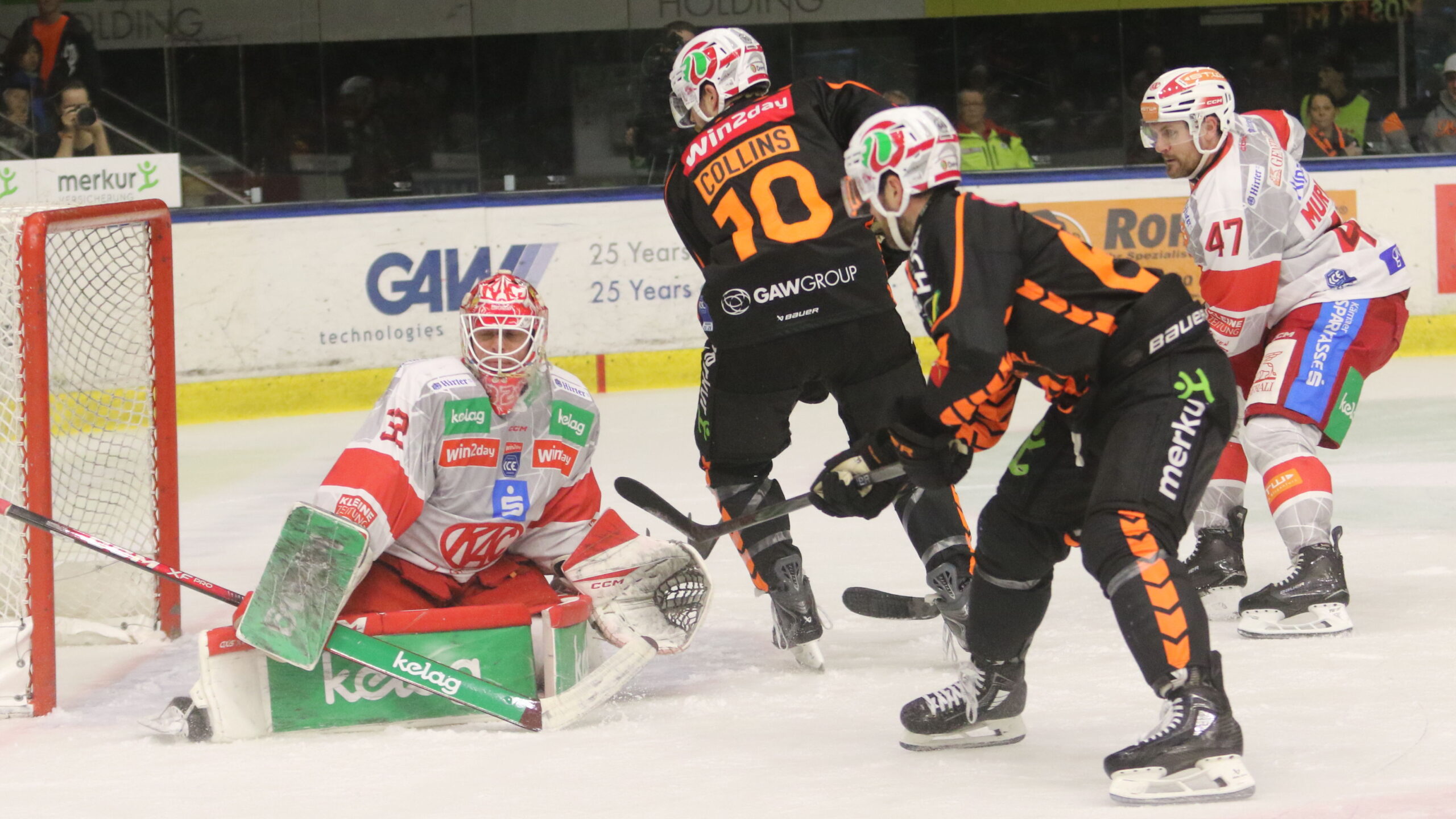 Sebastian Dahm #32, Chris Collins #10, Jordan Murray #47, ICEHL Round 12 Graz99ers – EC KAC, Merkur Eisstadion, © Puckfans.at / Andreas Robanser