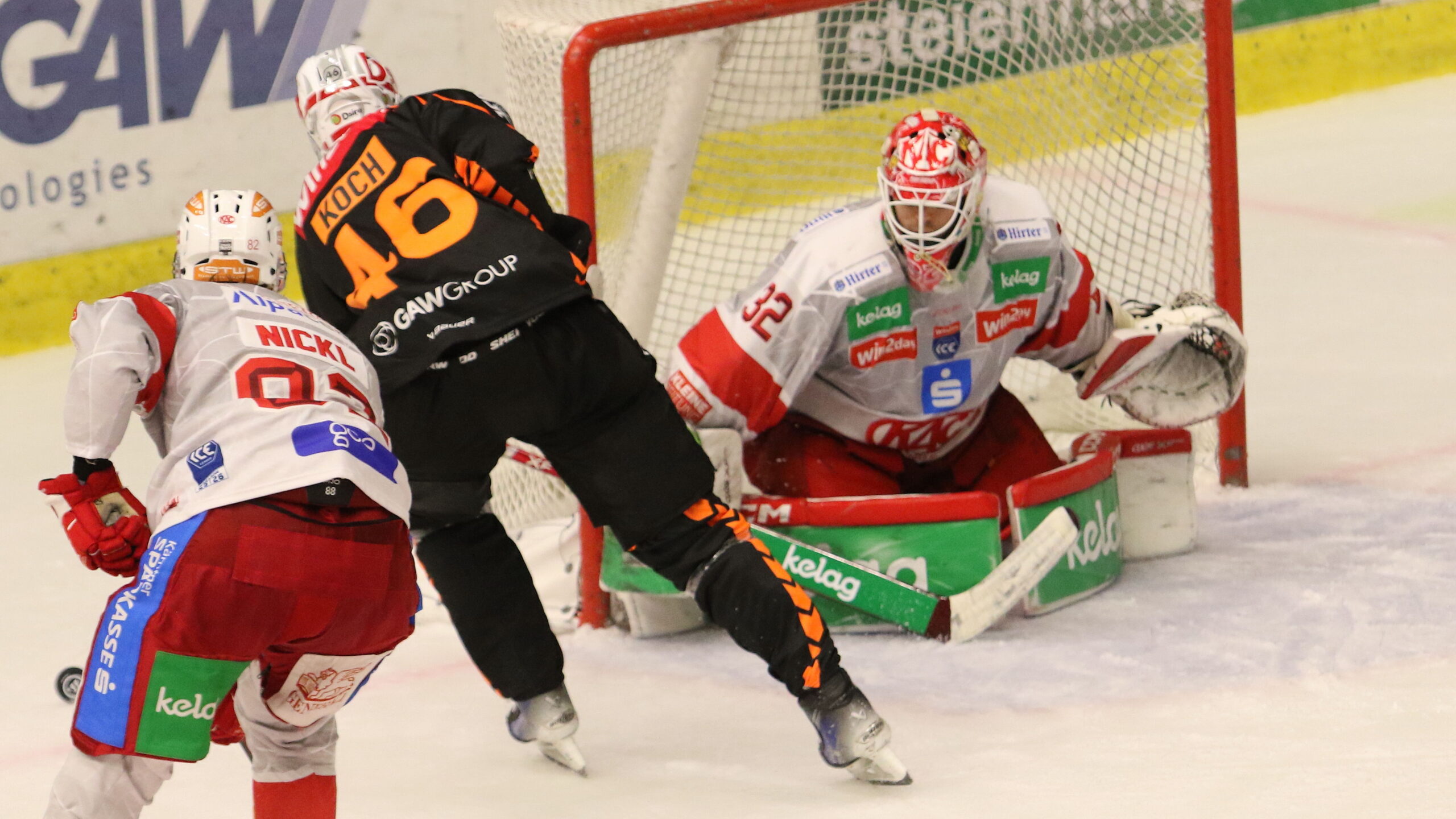 6T4A9370 19. Oktober 2025 2560 × 1440 6T4A9370 Anders Koch #46, Sebastian Dahm #32, ICEHL Round 12 Graz99ers – EC KAC, Merkur Eisstadion, © Puckfans.at / Andreas Robanser