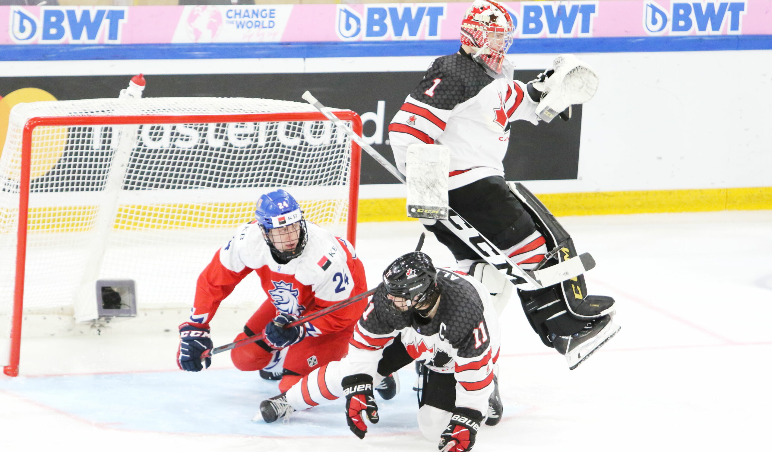6T4A9387 25. April 2023 2560 × 1498 6T4A9387 IIHF U18 World Championship CZE – CAN Jakub Stancl #24, Cameron Allen #11, Carson Bjarnason #1 Raiffeisen Arena, Porrentruy (Ajoie) © Puckfans.at / Andreas Robanser