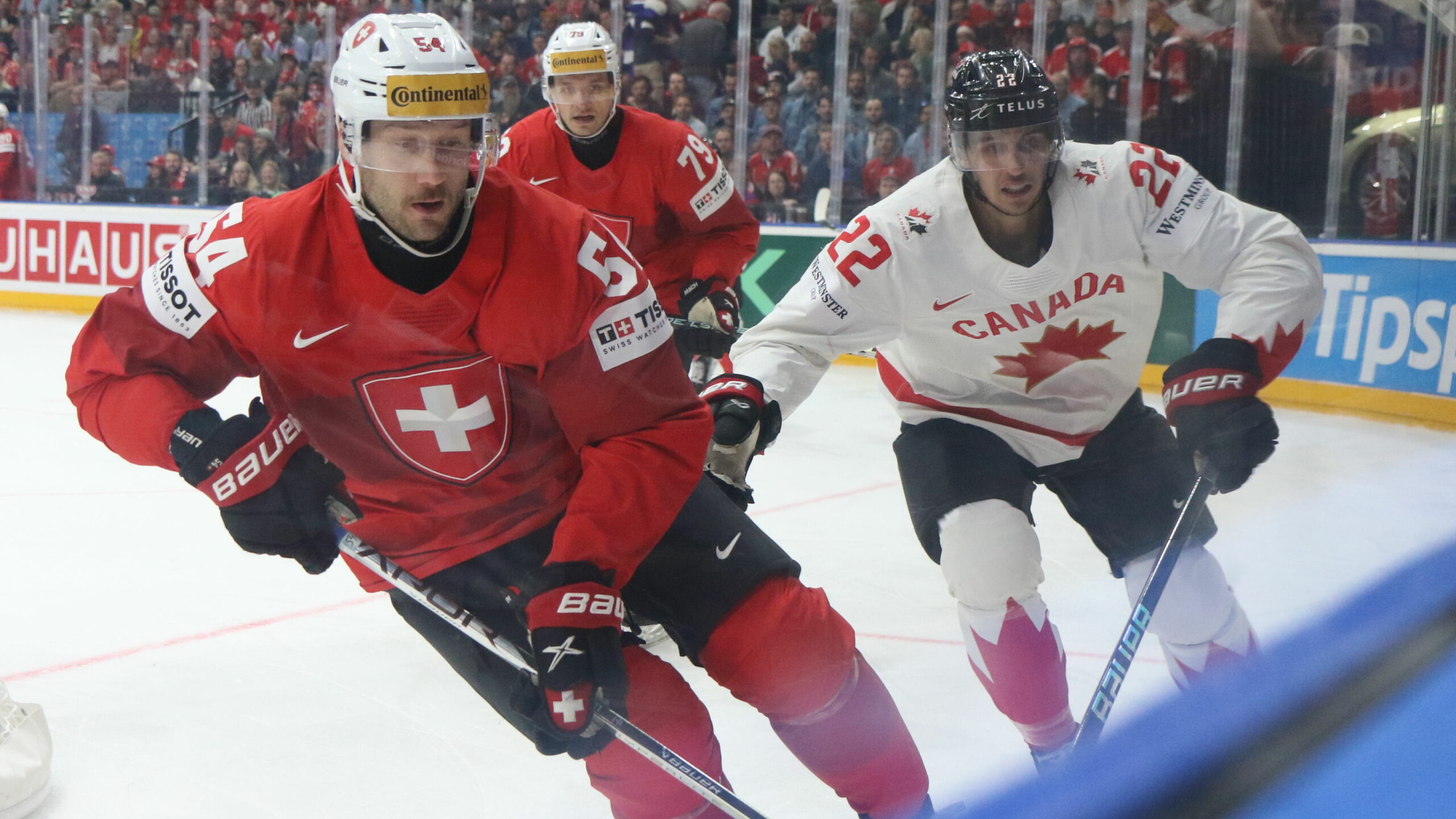 6T4A9513 19. Mai 2024 2560 × 1440 6T4A9513 IIHF World Championship 2024 SUI – CAN Christian Marti #54, Calvin Thürkauf #79, Dylan Cozens #22 Prague Arena, Prague CZE © Puckfans.at / Andreas Robanser