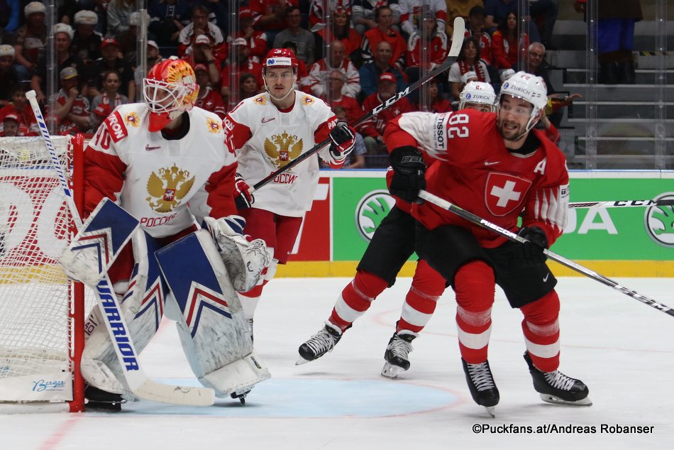IIHF World Championship, SUI – RUS 19. Mai 2019 950 × 634 IIHF World Championship, SUI – RUS IIHF World Championship, SUI – RUS Alexandar Georgiyev, Simon Moser #82 Ondrej Nepela Arena, Bratislava ©Puckfans.at/Andreas Robanser