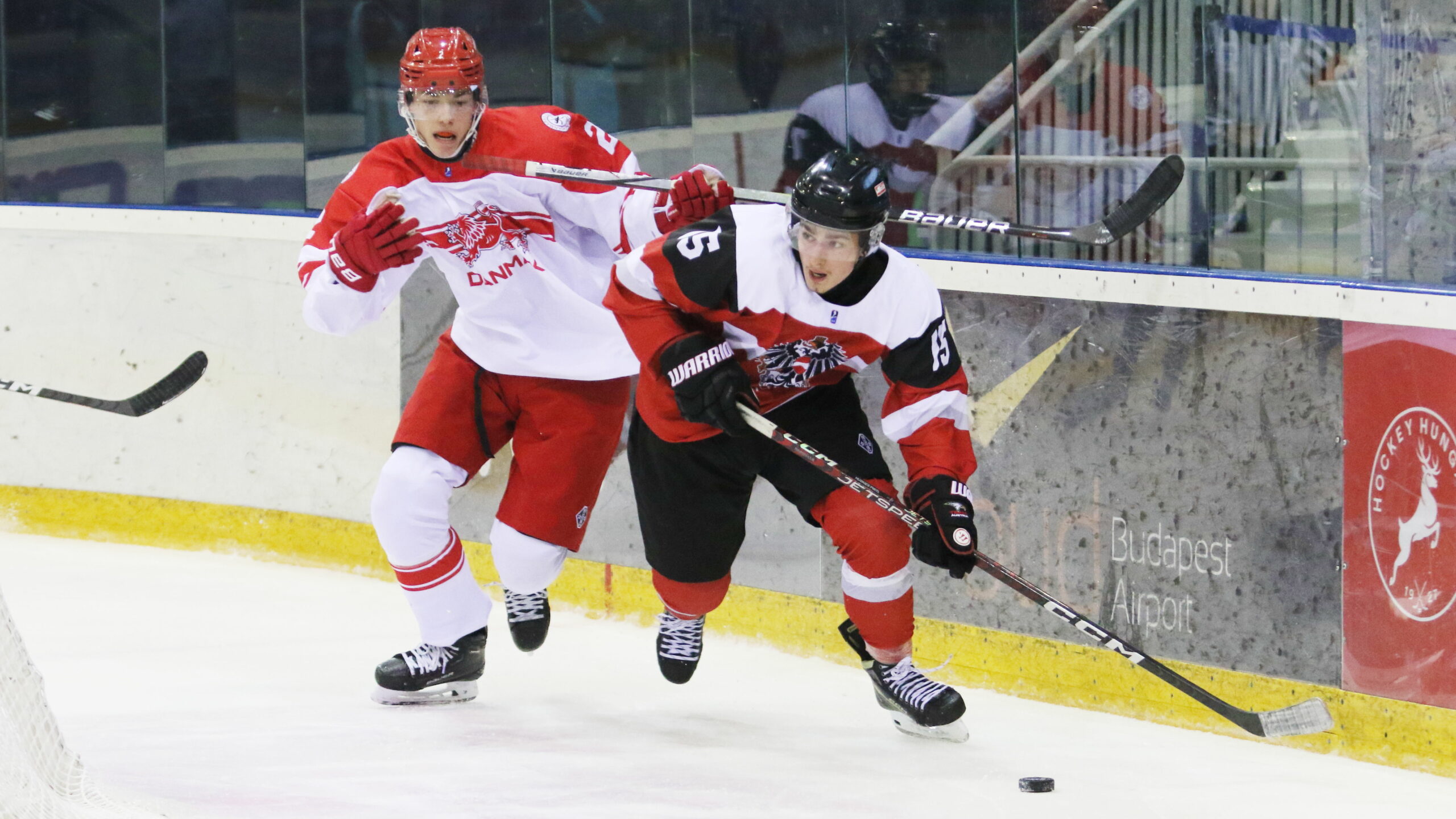 6T4A9806 13. Dezember 2023 2560 × 1440 6T4A9806 U20 IIHF World Championship Div 1A AUT – DEN Edvard Lundmark #2, Jonas Dobnig #15 Tuskecsarnok Arena, Budapest, © Puckfans.at / Andreas Robanser