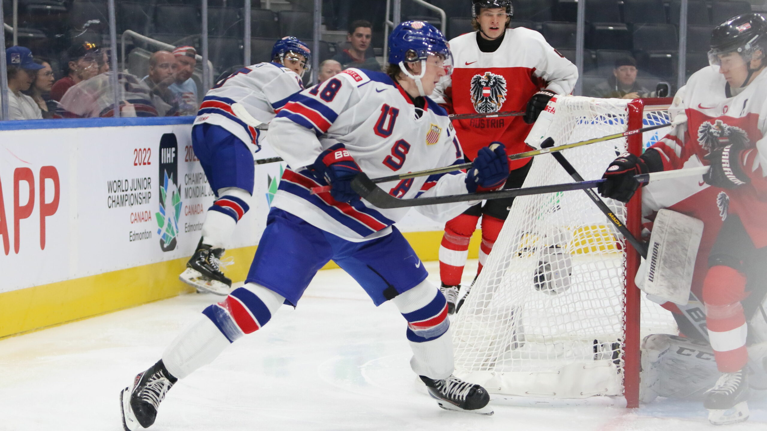 6T4A9932 13. August 2022 2560 × 1440 6T4A9932 IIHF World Juniors 2022, AUT – USA Logan Cooley #18, Rogers Place, Edmonton, © Puckfans.at/Andreas Robanser