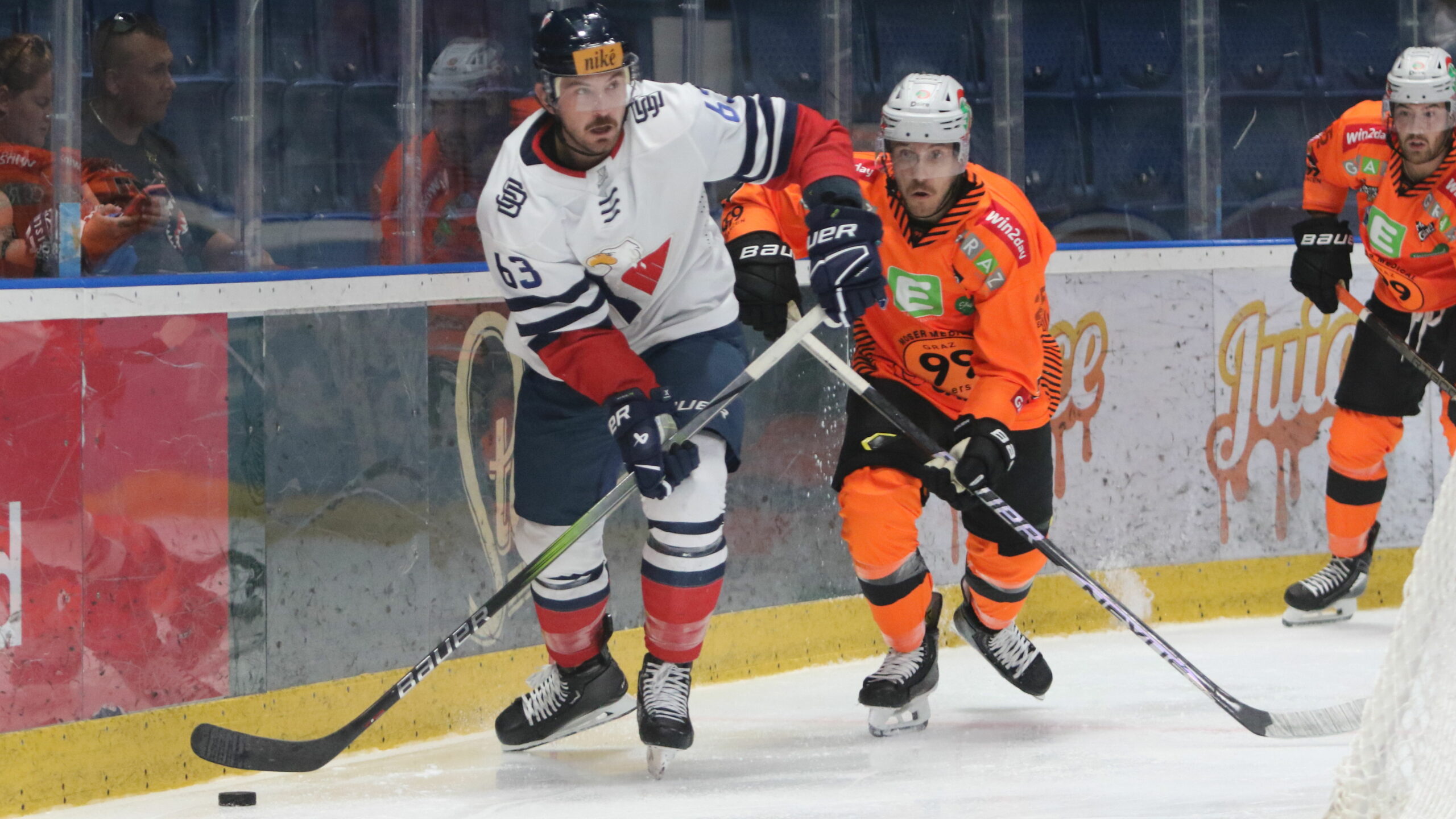 6T4A9749 24. August 2023 2560 × 1440 99ers bei Slovan Bratislava ohne Chance Pre-Season Game HC Slovan Bratislava – Graz99ers Chris Brown #63, Erik Kirchschläger #71 TIPOS Arena, Bratislava © Puckfans.at / Andreas Robanser