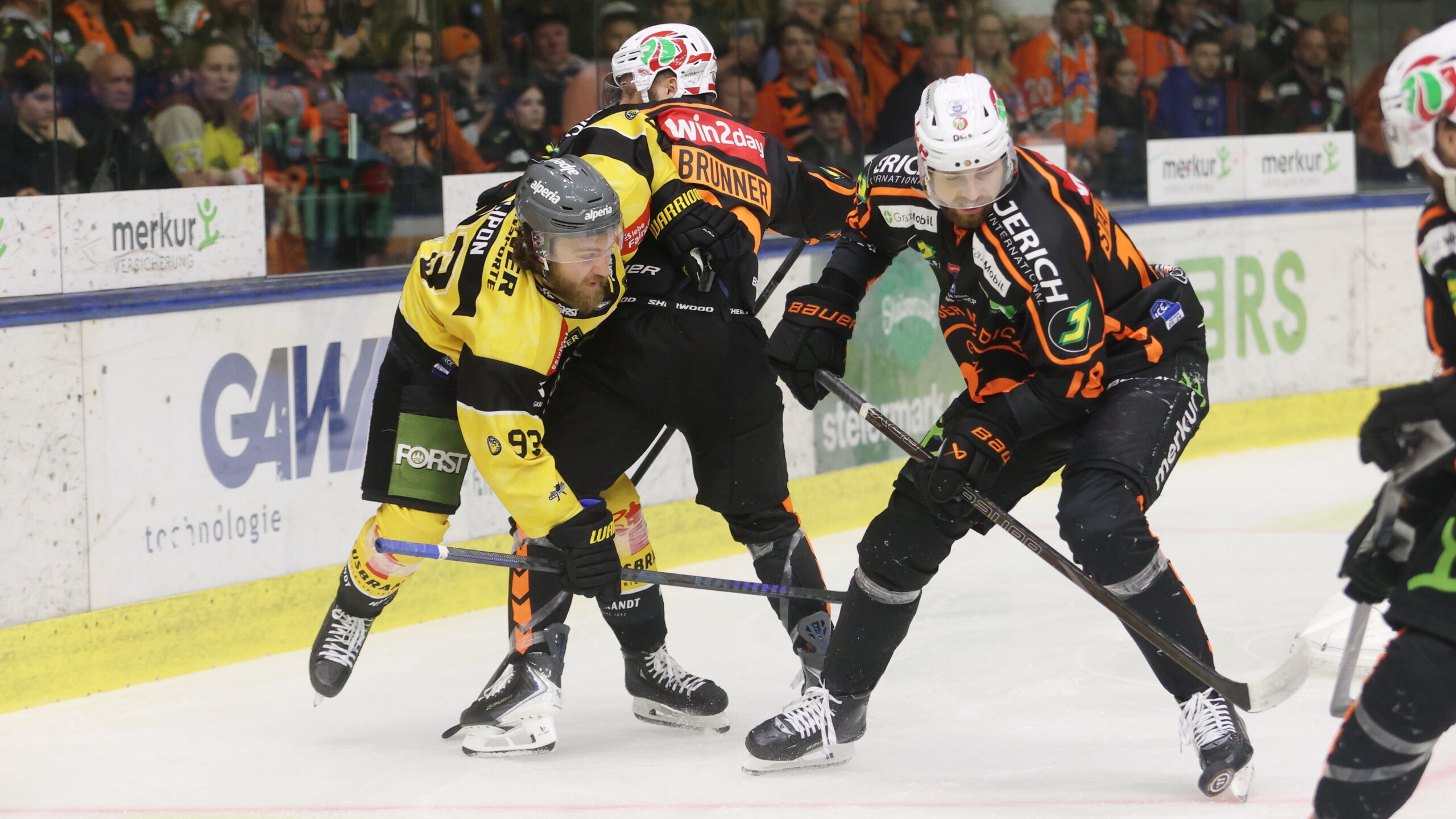 JC Lipon #93, Nico Brunner #20, Paul Stapelfeldt #18, ICEHL Final Game 3 Graz99ers – HC Pustertal, Merkur Eisstadion Graz, © Puckfans.at / Andreas Robanser