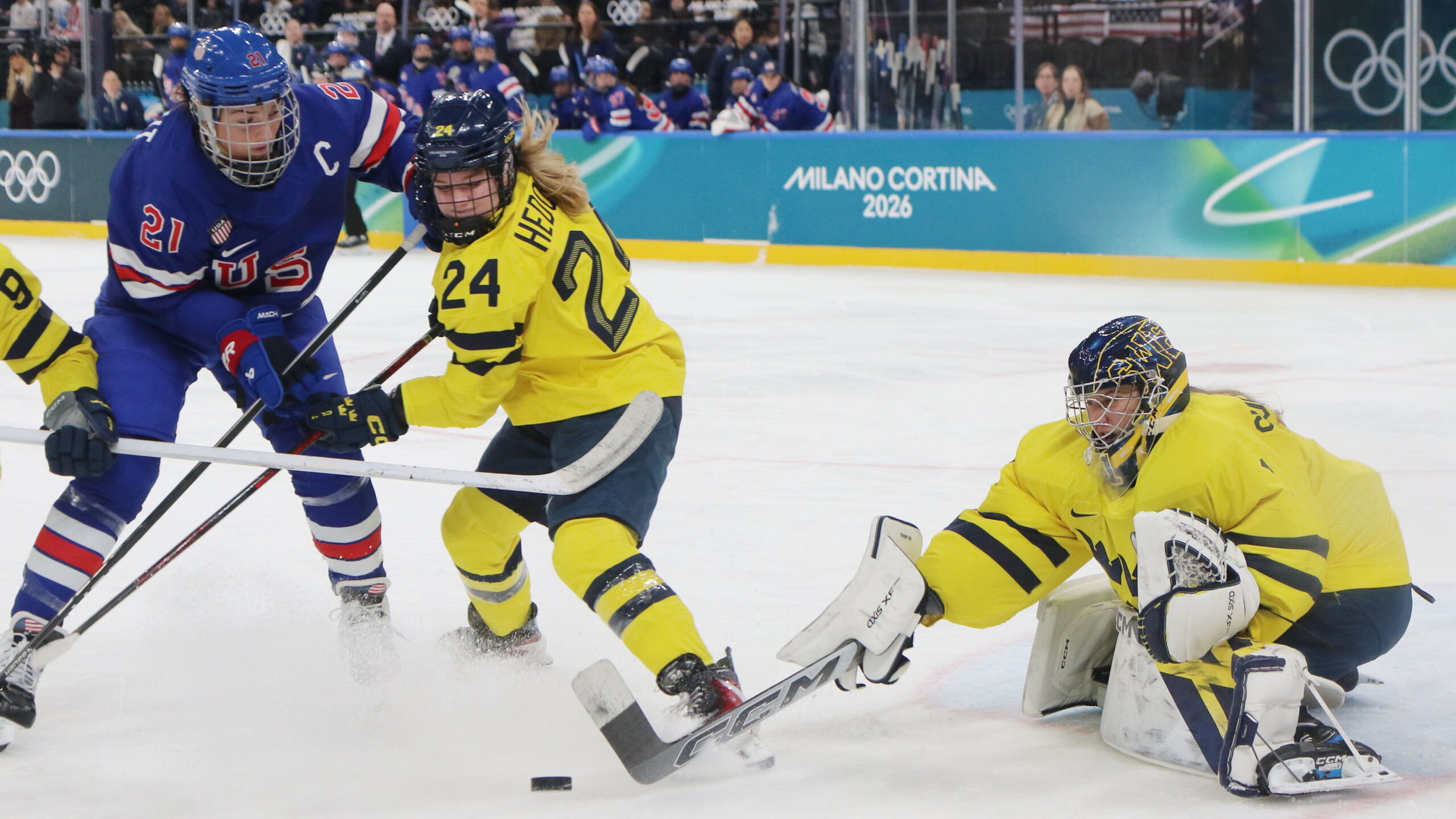 a6T4A0717 16. Februar 2026 2560 × 1440 a6T4A0717 Hilary Knight #21, Ebba Hedqvist #24, Ebba Svensson Träff #1, Olympic Games 2026 Womens Semifinal USA – SWE, Santa Giulia Arena, Milano © Puckfans.at / Andreas Robanser