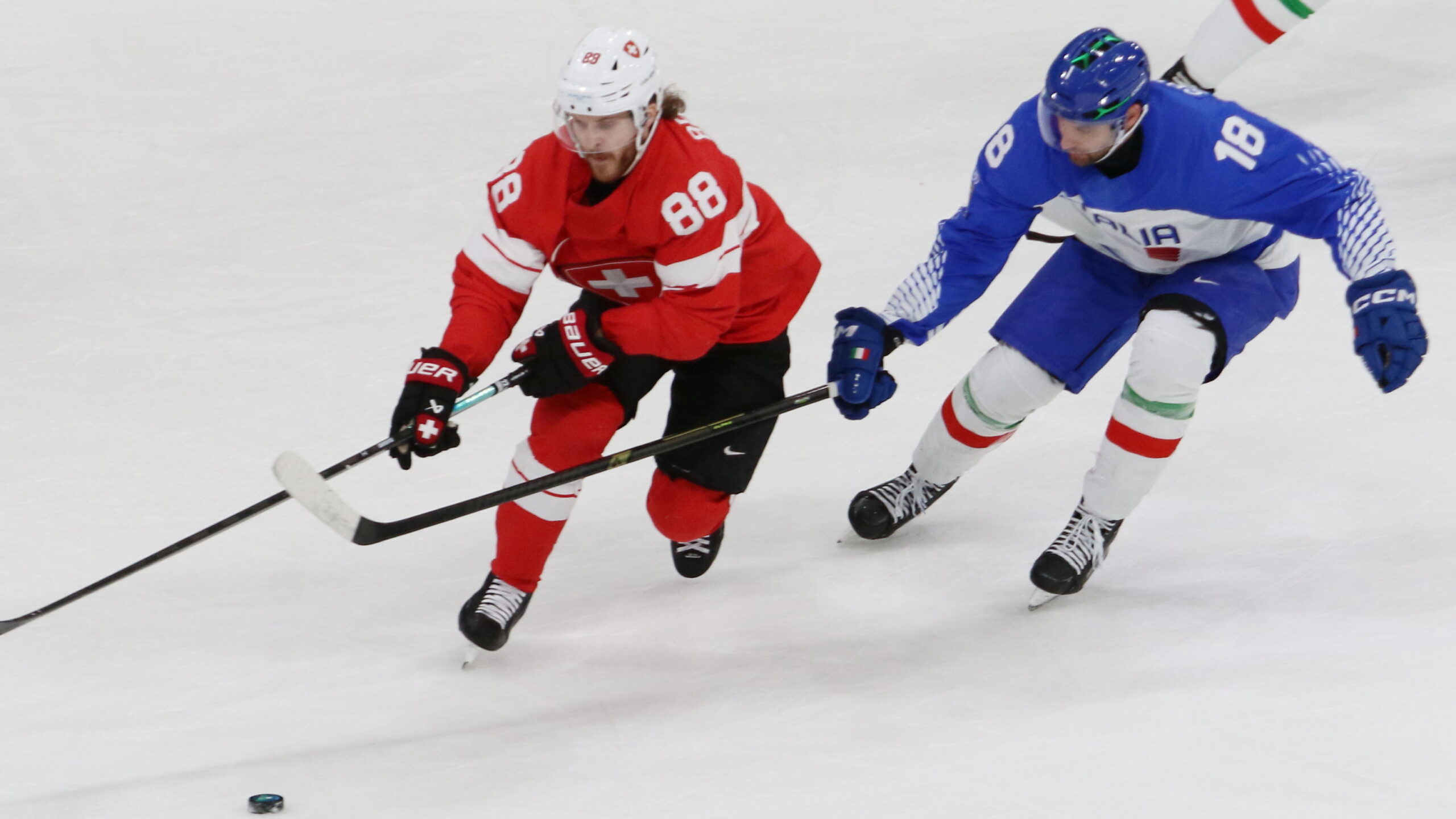 Christoph Bertschy #88, Nick Saracino #18, Olympic Games 2026 Mens QG SUI – ITA, Milano Rho Ice Arena, © Puckfans.at / Andreas Robanser