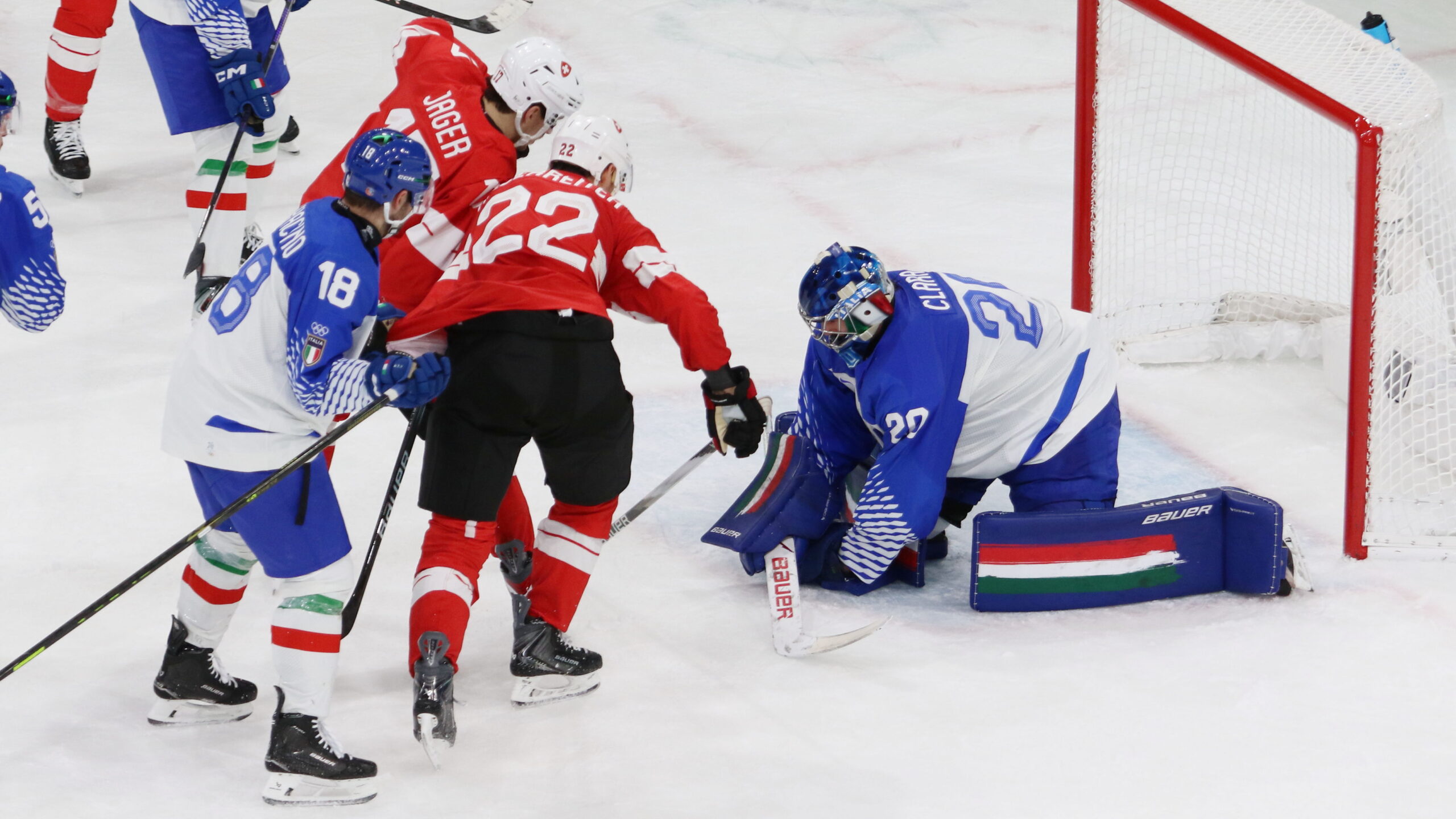 Nick Saracino #18, Ken Jäger #17, Nino Niederreiter #22, Damian Clara#20, Olympic Games 2026 Mens QG SUI – ITA, Milano Rho Ice Arena, © Puckfans.at / Andreas Robanser